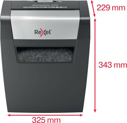 ¶La potencia para destruir mÇs! La destructora de papel Rexel Momentum X406 destruye hasta 6 hojas de una vez, funciona ininterrumpidamente durante 3 minutos y es ideal para uso domǸstico. P4, corte en confeti (partículas de 4 Ç? 30 mm). Papelera de 15 l de capacidad (125 hojas A4).Marca: