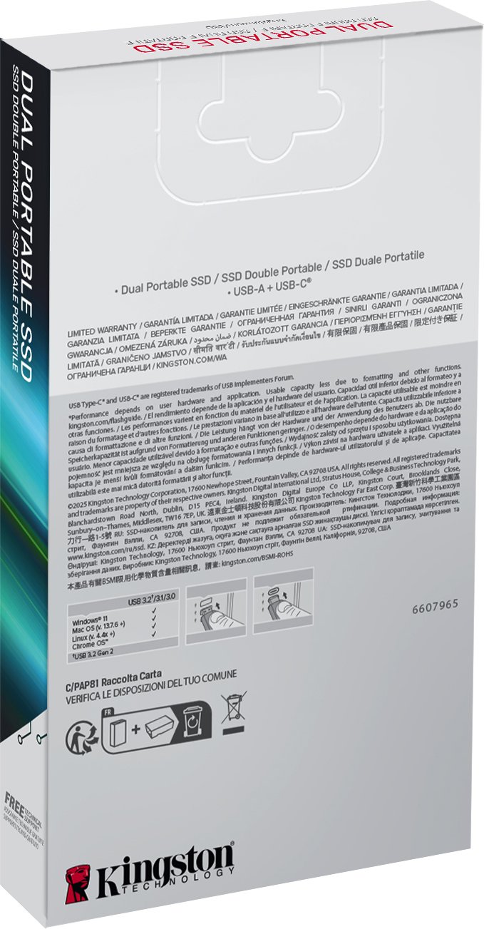 Kingston Technology 1TB Dual USB-A/C Portable SSD, Up to 1050MB/s USB 3.2 Gen 2. SDD, capacidad: 1 TB. Conector USB: USB Type-A / USB Type-C, Versión USB: 3.2 Gen 2 (3.1 Gen 2). Velocidad de lectura: 1050 MB/s, Velocidad de escritura: 950 MB/s. Color del producto: Negro, Rojo