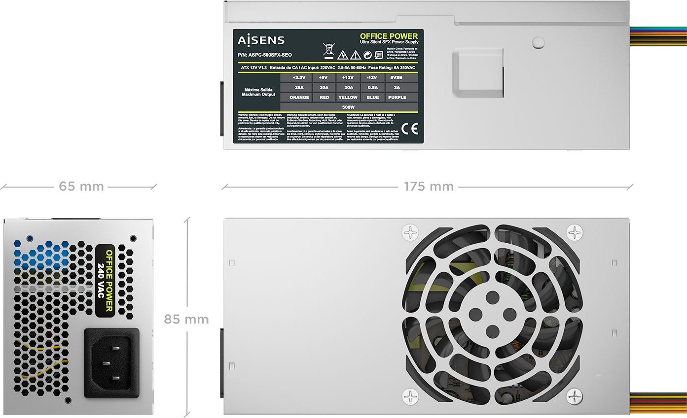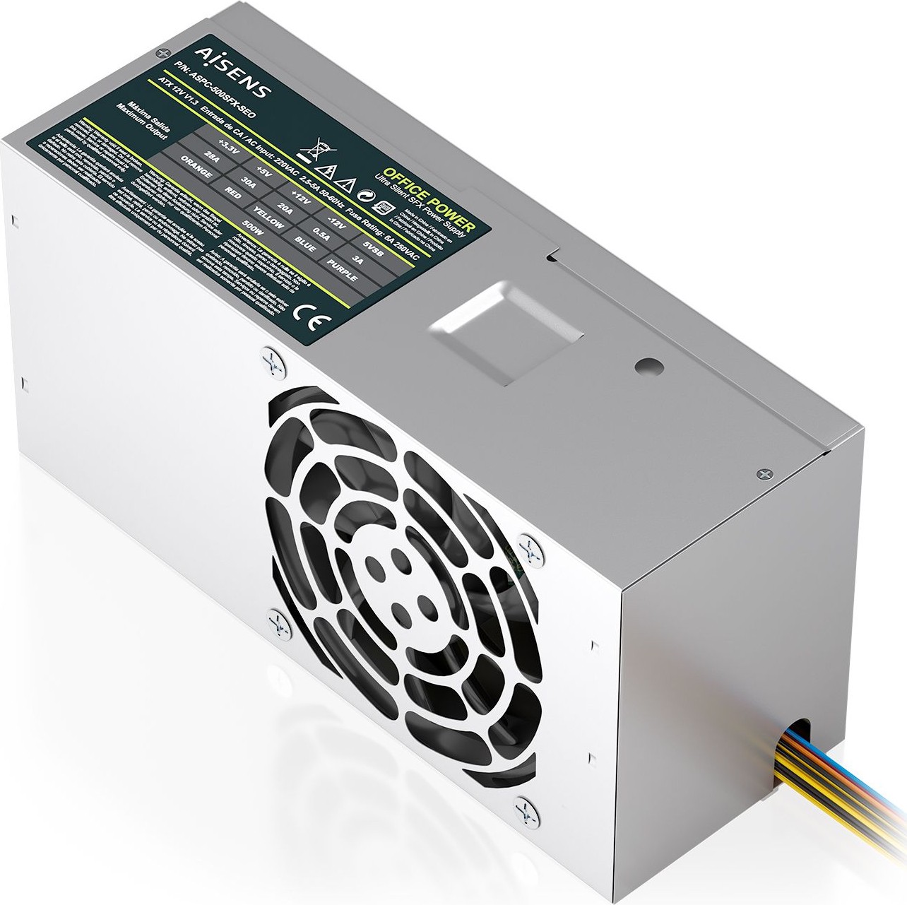 AISENS Fuente Alimentacion TFX 500W OEM, Plata. Potencia total: 500 W, Voltaje de entrada AC: 220 V, Frecuencia de entrada AC: 50/60 Hz. Alimentador de energía para tarjeta madre: 20+4 pin ATX, Longitud del cable de alimentación de la placa base: 35 cm, Longitud del cable de alimentación SATA: 330,480 mm. Utilizar con: PC, Factor de forma de fuente de alimentación (PSU): TFX. Color del producto: Plata, Tipo de enfriamiento: Activo, Diámetro de ventilador: 8 cm. Certificados de conformidad: CE, RoHS