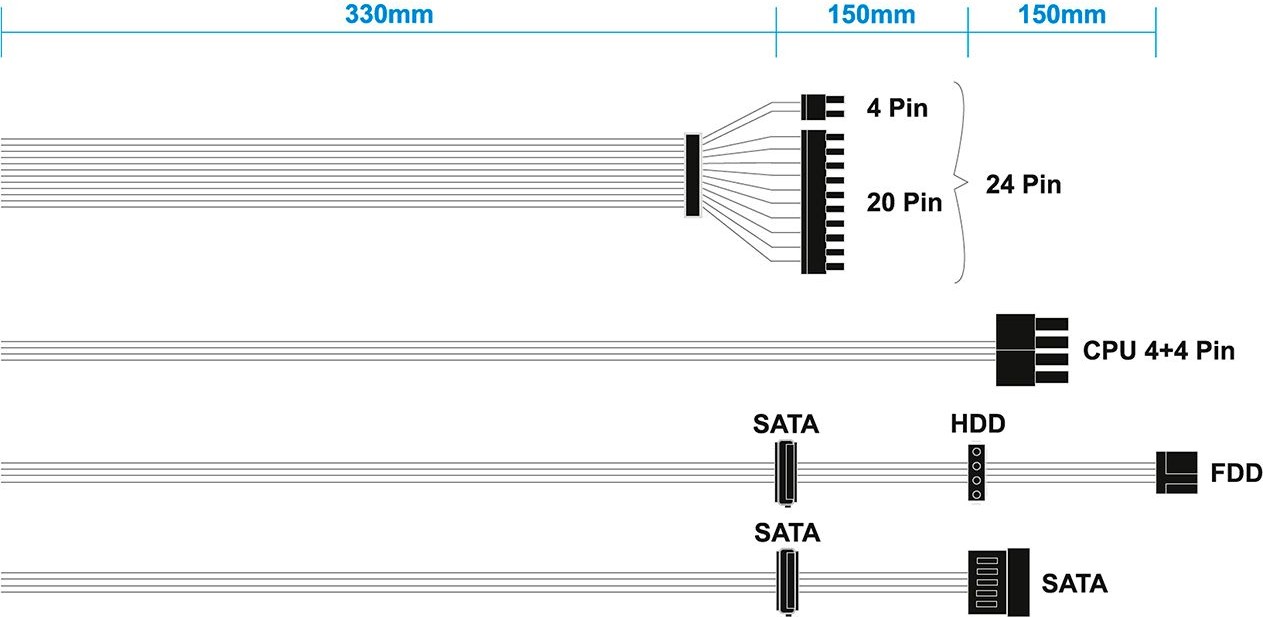 > 1 conector SATA + 1 conector Molex +1 conector mini-Molex (tipo Floppy, 4 pines) 330+150+150mm