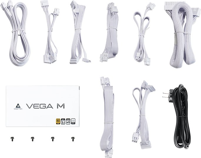 Chieftec Vega PPG-850-CW. Potencia total: 850 W, Voltaje de entrada AC: 100 - 240 V, Frecuencia de entrada AC: 50/60 Hz. Alimentador de energía para tarjeta madre: 20+4 pin ATX, Longitud del cable de alimentación de la placa base: 60 cm, Longitud del cable de alimentación SATA: 150,400 mm. Utilizar con: PC, Factor de forma de fuente de alimentación (PSU): ATX, Certificación 80 PLUS: 80 PLUS Gold. Color del producto: Blanco, Tipo de enfriamiento: Activo, Diámetro de ventilador: 13,5 cm. Certificación: 80PLUS Gold