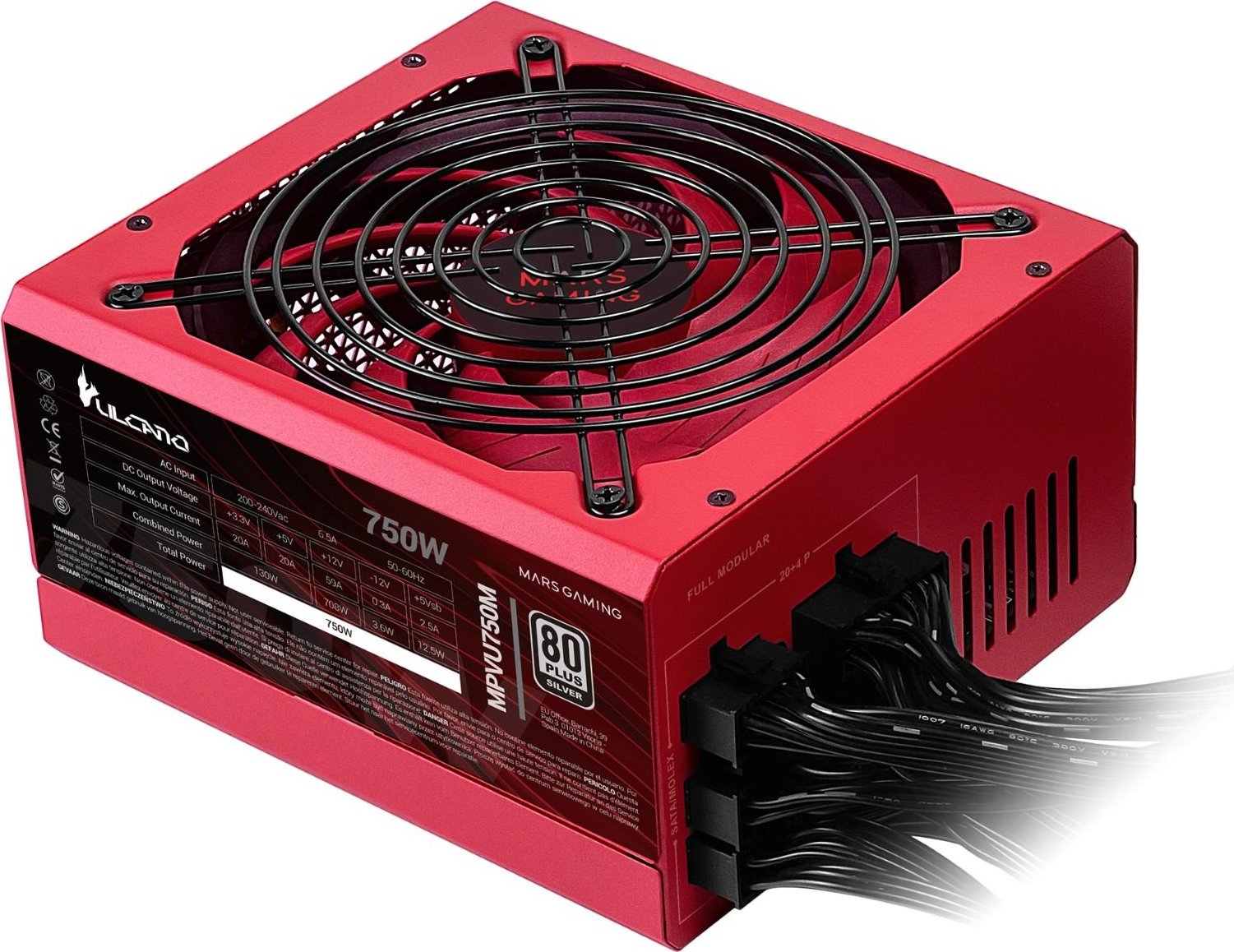 - MPVU750M, Fuente Alimentación Full Modular 750W ATX, 10 Años Garantía, 80Plus Silver +87% Eficiencia, Ventilador 140mm FDB con Tecnología AI-RPM, Condensadores Japoneses 105°, Rojo