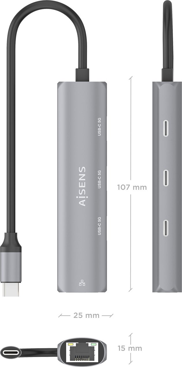 AISENS Dock USB-C A Ethernet Gigabit + Hub 3xUSB-C, Gris, 15cm. Tecnología de conectividad: Alámbrico, Interfaz de host: USB 3.2 Gen 1 (3.1 Gen 1) Type-C. Ethernet LAN, velocidad de transferencia de datos: 10,100,1000 Mbit/s, Estándares de red: IEEE 802.3, IEEE 802.3ab, IEEE 802.3u. Color del producto: Gris. Alimentación: USB, Conector eléctrico: USB Tipo C, Longitud del cable USB: 0,15 m. Sistema operativo Windows soportado: Windows 10, Windows 11