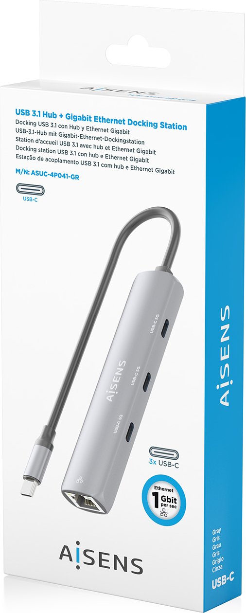 Aisens Dock Usb-c A Ethernet Gigabit + Hub 3xusb-c, Gris, 15cm