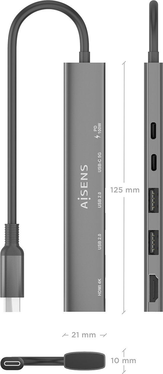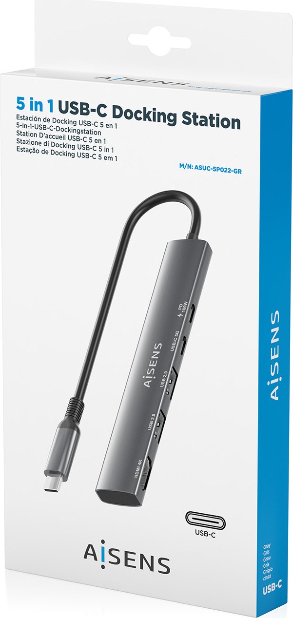 AISENS USB-C Dock 5 en 1, USB-C A, 1x HDMI 2x USB-A, 1x USB-C, 1x USB-C PD, Gris, 15cm. Tecnología de conectividad: Alámbrico, Interfaz de host: USB 3.2 Gen 1 (3.1 Gen 1) Type-C, Entrega de energía USB (USB Power Delivery) de hasta: 100 W. Color del producto: Gris, Velocidad de transferencia de datos: 5 Gbit/s, Resolución (máxima digital): 3840 x 2160 Pixeles. Alimentación: USB, Conector eléctrico: USB Tipo C, Longitud del cable USB: 0,15 m. Cantidad por paquete: 1 pieza(s), Ancho del paquete: 173 mm, Profundidad del paquete: 103 mm. Cantidad por caja: 40 pieza(s), Ancho de la caja principal: 220 mm, Longitud de la caja: 425 mm