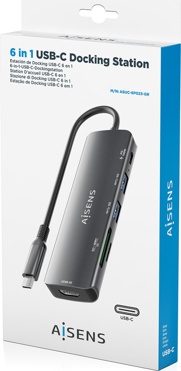 AISENS USB-C Dock 6 en 1, USB-C A, 1x HDMI, 2x USB-A, 1x USB-C PD 100W, 1x SD, 1x MicroSD, Gris, 15cm. Tecnología de conectividad: Alámbrico, Interfaz de host: USB 3.2 Gen 1 (3.1 Gen 1) Type-C, Entrega de energía USB (USB Power Delivery) de hasta: 100 W. Color del producto: Gris, Tarjetas de memoria compatibles: MMC, MicroSD (TransFlash), MicroSDHC, MicroSDXC, RS-MMC, SD, SDHC, SDXC, Velocidad de transferencia de datos: 5 Gbit/s. Alimentación: USB, Conector eléctrico: USB Tipo C, Longitud del cable USB: 0,15 m. Cantidad por paquete: 1 pieza(s), Ancho del paquete: 173 mm, Profundidad del paquete: 103 mm. Cantidad por caja: 40 pieza(s), Ancho de la caja principal: 220 mm, Longitud de la caja: 425 mm