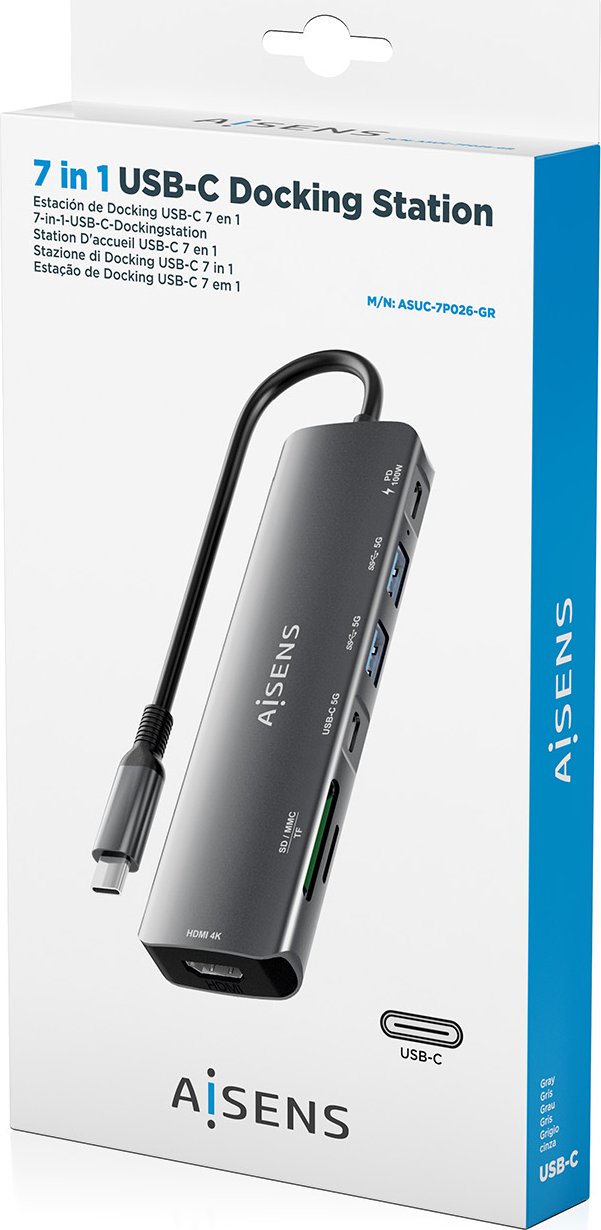 AISENS USB-C Dock 7 en 1, USB-C A, 1x HDMI, 2x USB-A, 1x USB-C, 1x USB-C PD 100W, 1x SD, 1x MicroSD, Gris, 15cm. Tecnología de conectividad: Alámbrico, Interfaz de host: USB 3.2 Gen 1 (3.1 Gen 1) Type-C, Entrega de energía USB (USB Power Delivery) de hasta: 100 W. Color del producto: Gris, Tarjetas de memoria compatibles: MMC, MicroSD (TransFlash), MicroSDHC, MicroSDXC, RS-MMC, SD, SDHC, SDXC, Velocidad de transferencia de datos: 5 Gbit/s. Alimentación: USB, Conector eléctrico: USB Tipo C, Longitud del cable USB: 0,15 m. Cantidad por paquete: 1 pieza(s), Ancho del paquete: 173 mm, Profundidad del paquete: 103 mm. Cantidad por caja: 40 pieza(s), Ancho de la caja principal: 220 mm, Longitud de la caja: 425 mm