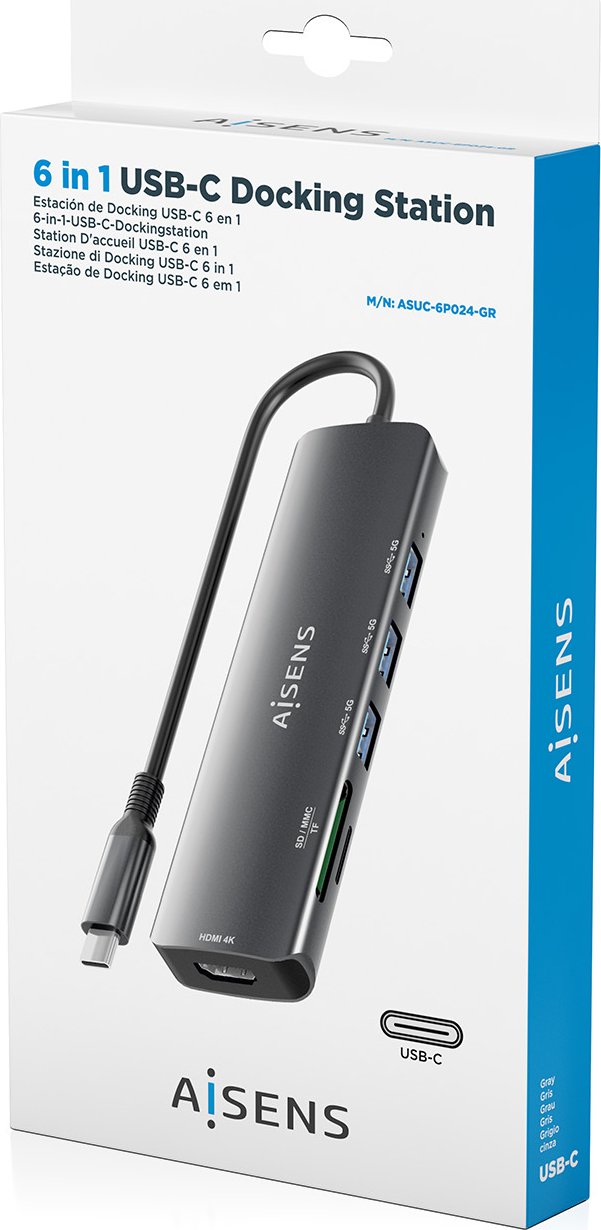 AISENS USB-C Dock 6 en 1, USB-C A, 1x HDMI, 3x USB-A, 1x SD, 1x MicroSD, Gris, 15cm. Tecnología de conectividad: Alámbrico, Interfaz de host: USB 3.2 Gen 1 (3.1 Gen 1) Type-C. Color del producto: Gris, Tarjetas de memoria compatibles: MMC, MicroSD (TransFlash), MicroSDHC, MicroSDXC, RS-MMC, SD, SDHC, SDXC, Velocidad de transferencia de datos: 5 Gbit/s. Alimentación: USB, Conector eléctrico: USB Tipo C, Longitud del cable USB: 0,15 m. Cantidad por paquete: 1 pieza(s), Ancho del paquete: 173 mm, Profundidad del paquete: 103 mm. Cantidad por caja: 40 pieza(s), Ancho de la caja principal: 220 mm, Longitud de la caja: 425 mm