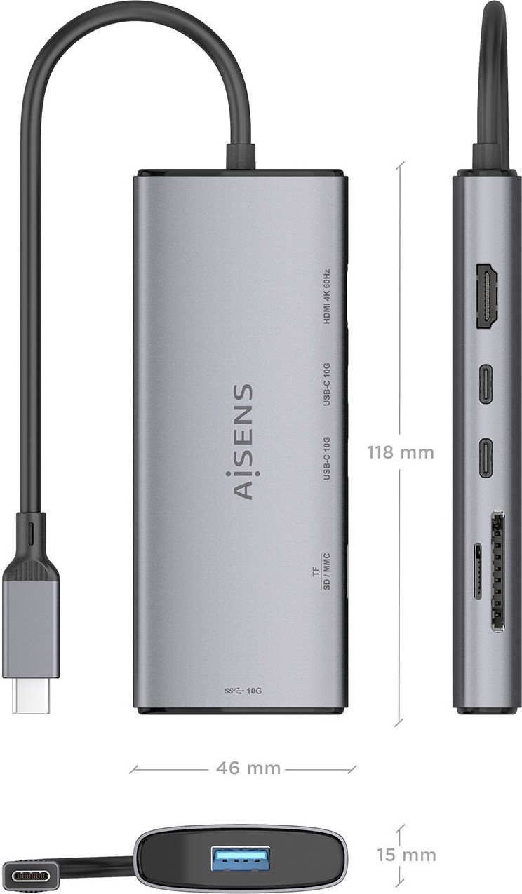 AISENS USB-C Dock 6 en 1, USB-C a 1xHDMI, 1xUSB-A 10G, 2xUSB-C 10G, 1xSD, 1xMicroSD, Gris, 20cm. Tecnología de conectividad: Alámbrico, Interfaz de host: USB 3.2 Gen 1 (3.1 Gen 1) Type-C. Color del producto: Gris, Tarjetas de memoria compatibles: MMC, MicroSDHC, MicroSDXC, RS-MMC, SD, SDHC, SDXC, Velocidad de transferencia de datos: 10 Gbit/s. Alimentación: USB, Conector eléctrico: USB Tipo C, Longitud del cable USB: 0,2 m. Ancho: 46 mm, Profundidad: 118 mm, Altura: 15 mm. Cantidad por paquete: 1 pieza(s), Ancho del paquete: 190 mm, Profundidad del paquete: 103 mm