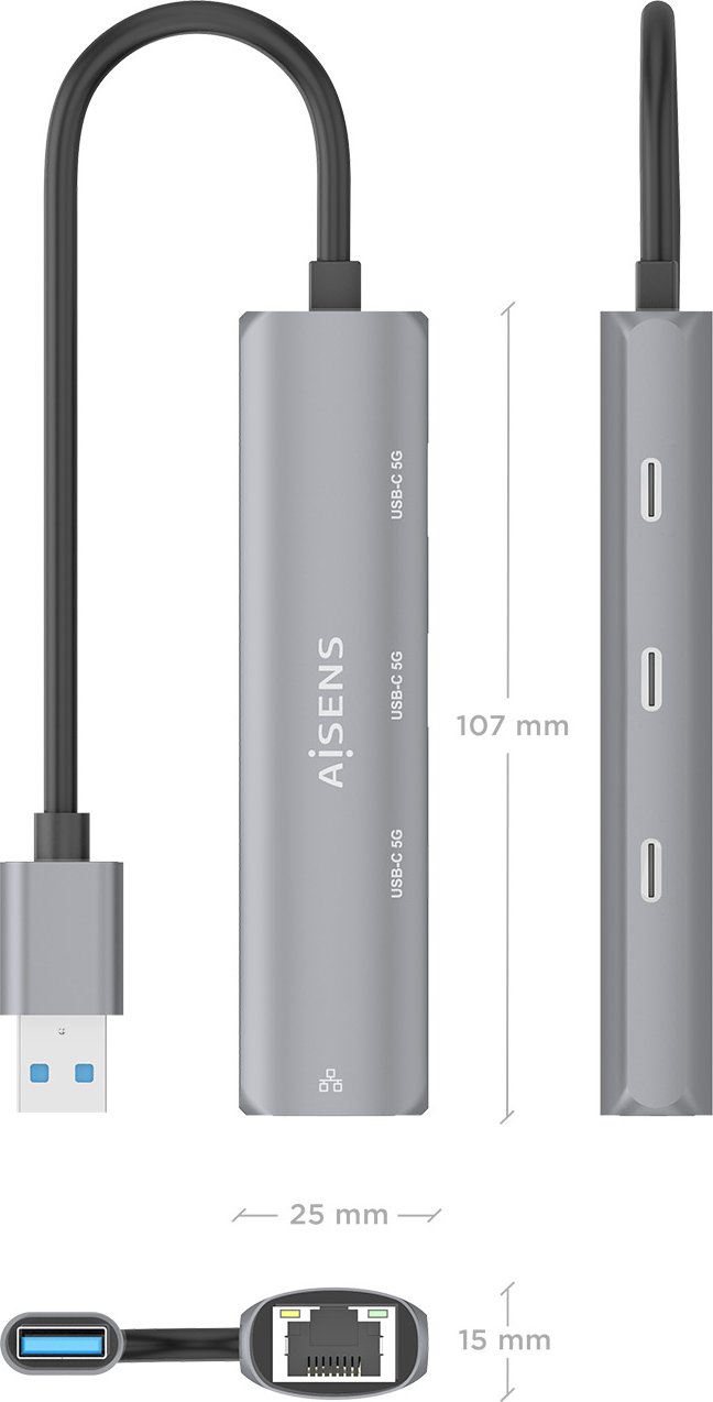 AISENS USB3.0 Dock USB-A A Ethernet Gigabit + Hub 3xUSB-C, Gris, 15cm. Tecnología de conectividad: Alámbrico, Interfaz de host: USB 3.2 Gen 1 (3.1 Gen 1) Type-A. Ethernet LAN, velocidad de transferencia de datos: 10,100,1000 Mbit/s, Estándares de red: IEEE 802.3, IEEE 802.3ab, IEEE 802.3u. Color del producto: Gris. Alimentación: USB, Conector eléctrico: USB tipo A, Longitud del cable USB: 0,15 m. Sistema operativo Windows soportado: Windows 10, Windows 11