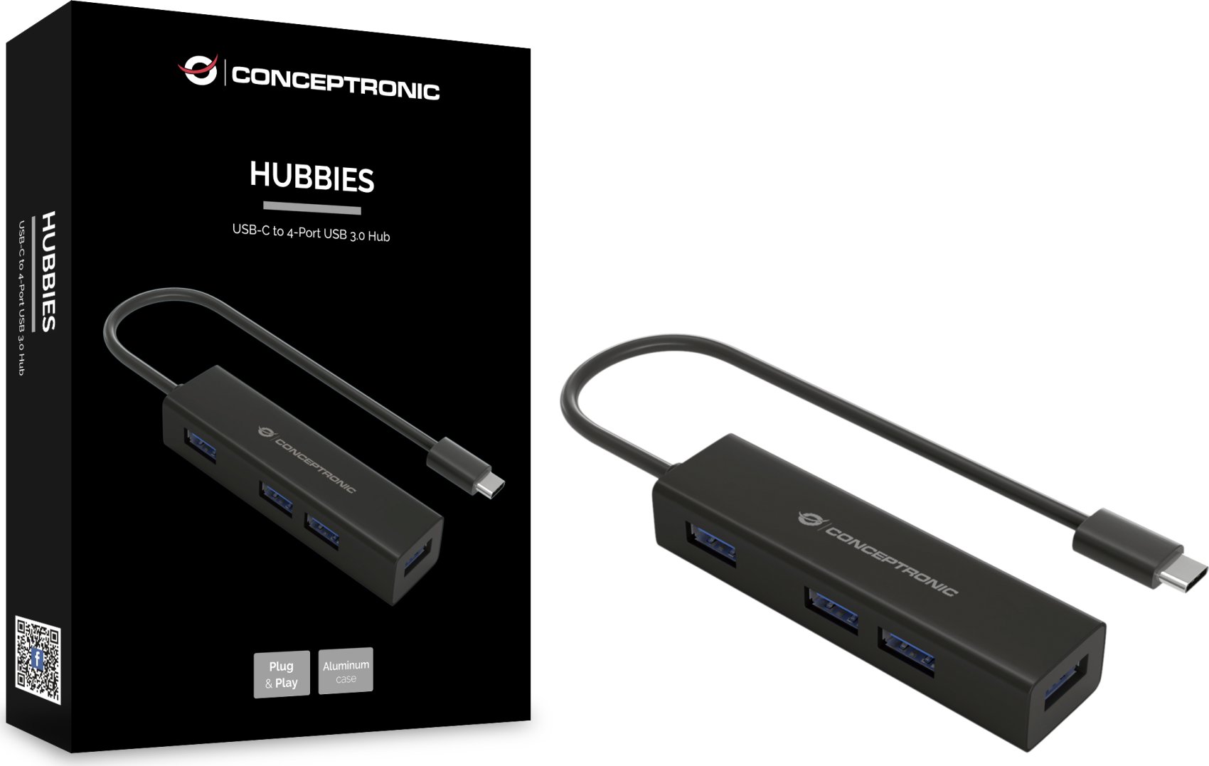 Conceptronic HUBBIES07B. Interfaz de host: USB 3.2 Gen 1 (3.1 Gen 1) Type-C, Interfaces de concentradores: USB 3.2 Gen 1 (3.1 Gen 1) Type-A. Velocidad de transferencia de datos: 5000 Mbit/s, Color del producto: Negro, Material de la carcasa: Aluminio. Ancho: 87,5 mm, Profundidad: 23,4 mm, Altura: 16,5 mm. Cantidad por paquete: 1 pieza(s), Ancho del paquete: 112,5 mm, Profundidad del paquete: 24,5 mm
