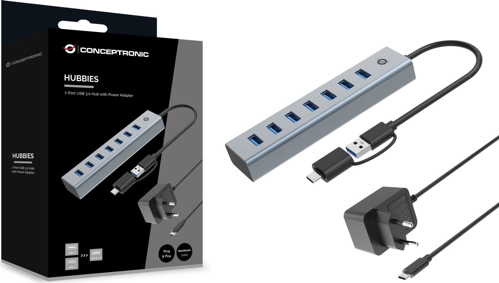 Conceptronic HUBBIES21GP. Interfaz de host: USB 3.2 Gen 1 (3.1 Gen 1) Type-A, Interfaces de concentradores: USB 3.2 Gen 1 (3.1 Gen 1) Type-A. Velocidad de transferencia de datos: 5000 Mbit/s, Color del producto: Gris, Material de la carcasa: Aluminio. Tipo de fuente de alimentación: USB/AC. Sistema operativo Windows soportado: Windows 11 Enterprise x64, Windows 7 Professional x64, Windows Vista Enterprise x64, Windows 10,..., Sistema operativo MAC soportado: Mac OS X 10.10 Yosemite, Mac OS X 10.11 El Capitan, Mac OS X 10.12 Sierra, Mac OS X 10.13 High..., Otros sistemas operativos soportados: Android. Ancho: 138 mm, Profundidad: 32 mm, Altura: 19 mm