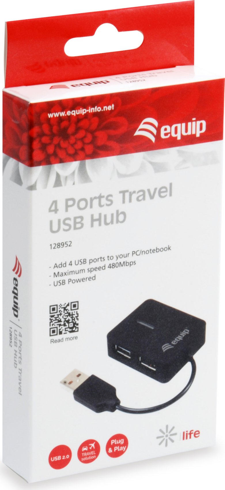 Equip 128952. Interfaz de host: USB 2.0, Interfaces de concentradores: USB 2.0. Velocidad de transferencia de datos: 480 Mbit/s, Color del producto: Negro, Material de la carcasa: Plástico. Alimentación: USB. Ancho: 40 mm, Profundidad: 50 mm, Altura: 10 mm. Cantidad por paquete: 1 pieza(s), Tipo de embalaje: Caja