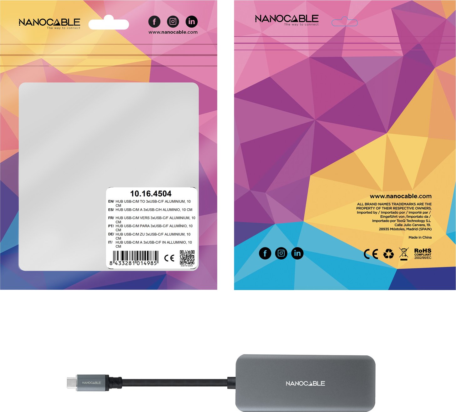 Nanocable Hub USB-C macho a 4 x USB-C hembra, Aluminio 10 cm, Gris. Interfaz de host: USB 3.2 Gen 1 (3.1 Gen 1) Type-C, Interfaces de concentradores: USB 3.2 Gen 1 (3.1 Gen 1) Type-C. Velocidad de transferencia de datos: 5000 Mbit/s, Color del producto: Gris, Material de la carcasa: Aluminio. Tipo de fuente de alimentación: USB. Cantidad por paquete: 1 pieza(s), Ancho del paquete: 135 mm, Profundidad del paquete: 10 mm. Contenido del paquete: 1 x Hub USB-C