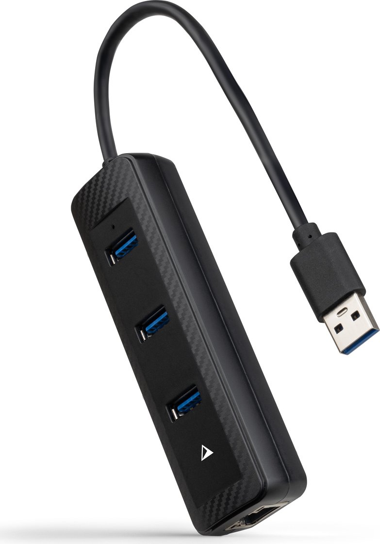 Hub USB-A 3.0 a 3 puertos USB-A 3.0 y Ethernet RJ45, con conector USB-A 3.0 macho en un extremo y 3 puertos USB-A 3.0 hembra y RJ45 hembra en el otro.