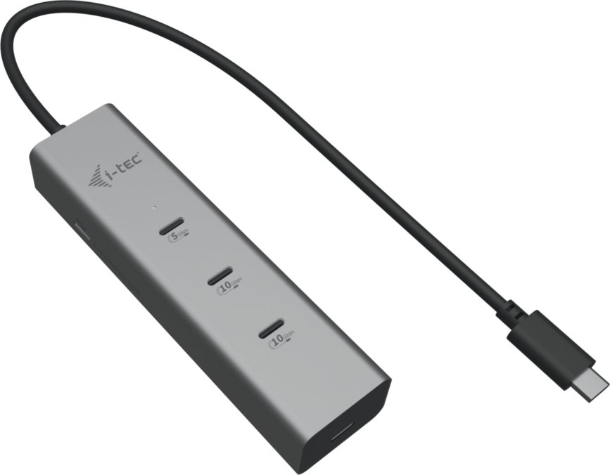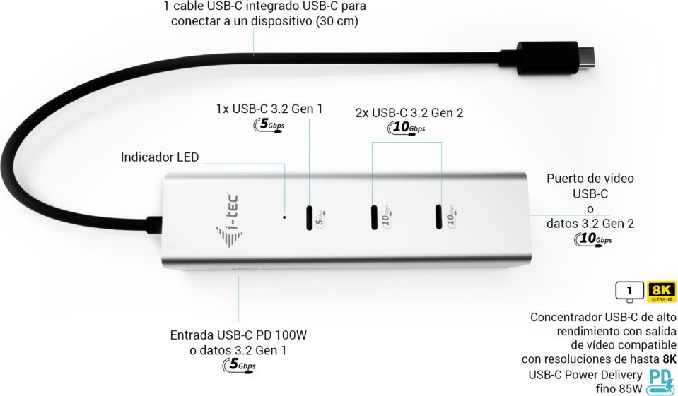 i-tec Metal USB-C Charging HUB 5port with USB-C video 8K + Power Delivery 85W. Interfaz de host: USB Tipo C, Interfaces de concentradores: USB Tipo C. Velocidad de transferencia de datos: 10000 Mbit/s, Máxima velocidad de actualización: 144 Hz, Color del producto: Plata. Consumo energético: 15 W. Otros sistemas operativos soportados: Android, ChromeOS, iPadOS. Ancho: 115 mm, Profundidad: 30 mm, Altura: 21 mm