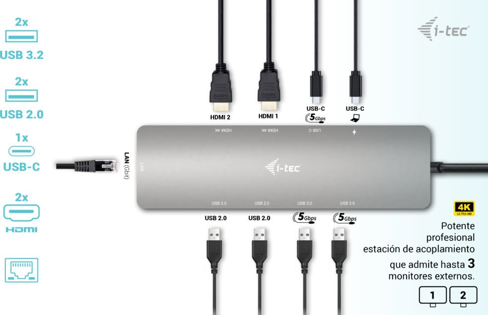 Pequeña estación de acoplamiento USB-C metálica capaz de admitir hasta dos monitores externos simultáneamente*. Solo tiene que conectar su portátil o tableta (sin necesidad de instalar controladores) y disfrutar de las ventajas de una rápida transferencia de datos USB y conexión a Internet a través de un puerto LAN. Y, por supuesto, la base de conexión también puede alimentar su portátil con hasta 100 W, lo que significa que podrá cargar todos los portátiles y tabletas que admitan la carga a través de USB-C (USB-C Power Delivery).