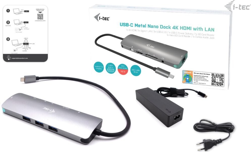 - USB-C Metal Nano Docking Station 4K HDMI LAN with Power Delivery 100W + i-tec Universal Charger 100W