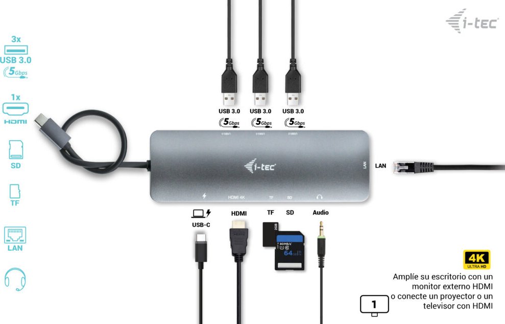 i-tec USB-C Metal Nano Docking Station 4K HDMI LAN with Power Delivery 100W + Universal Charger 100W. Tecnología de conectividad: Alámbrico, Interfaz de host: USB 3.2 Gen 1 (3.1 Gen 1) Type-C, Entrega de energía USB (USB Power Delivery) de hasta: 100 W. Ethernet LAN, velocidad de transferencia de datos: 100,1000 Mbit/s. Color del producto: Gris, Tarjetas de memoria compatibles: MicroSD (TransFlash), SD, Velocidad de transferencia de datos: 5 Gbit/s. Alimentación: Corriente alterna, Fuente de alimentación: 100 W, Voltaje de salida: 5 / 9 / 12 / 15 / 20 V. Otros sistemas operativos soportados: Android, ChromeOS