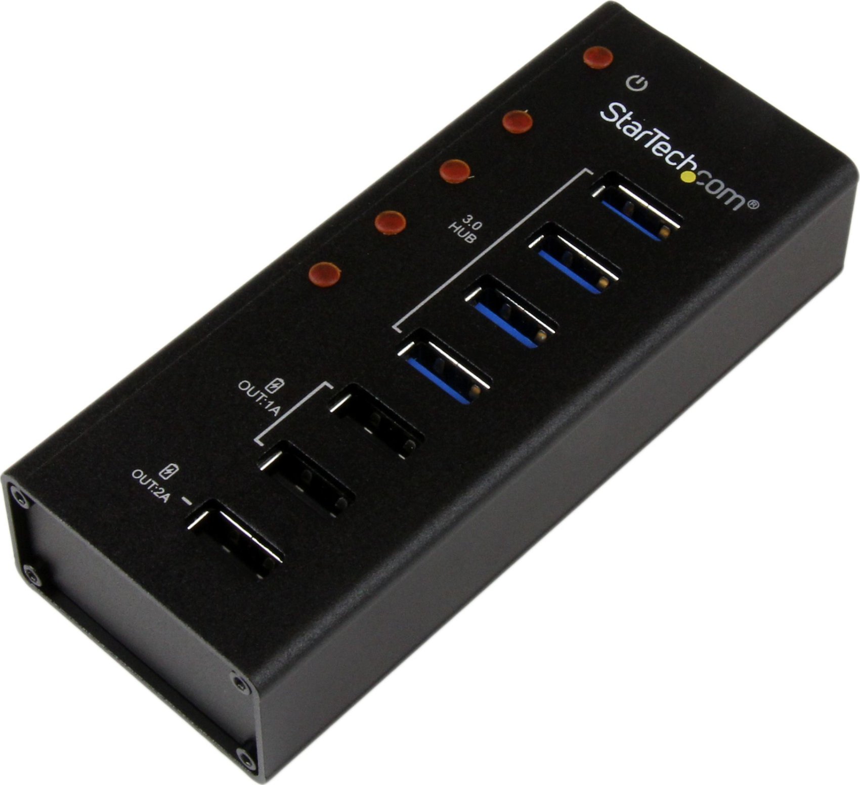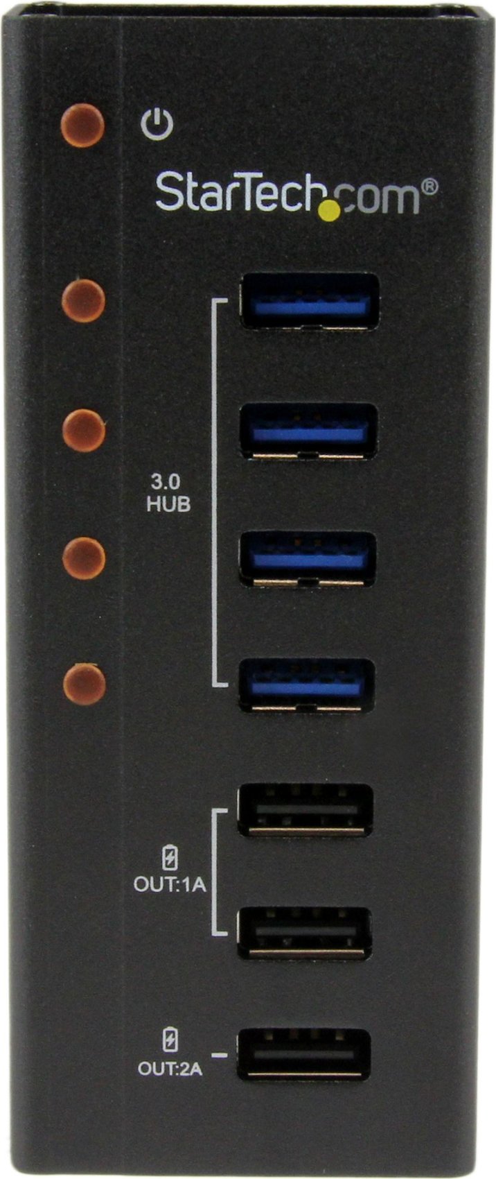 StarTech.com Hub Concentrador USB 3.0 (5Gbps) de 4 Puertos y 3 Puertos de Carga USB ( 2x 1A y 1x 2A) - Ladrón con Carcasa de Metal. Interfaz de host: USB 3.2 Gen 1 (3.1 Gen 1) Type-B, Interfaces de concentradores: USB 2.0, USB 3.2 Gen 1 (3.1 Gen 1) Type-A. Velocidad de transferencia de datos: 5000 Mbit/s, Color del producto: Negro, Material de la carcasa: Aluminio. Tipo de fuente de alimentación: CC, Voltaje de entrada: 100 - 240 V, Corriente de entrada: 1.3 A. Sistema operativo MAC soportado: Mac OS X 10.5 Leopard, Mac OS X 10.6 Snow Leopard, Mac OS X 10.7 Lion, Mac OS X 10.8 Mountain.... Ancho: 45 mm, Profundidad: 110 mm, Altura: 24 mm