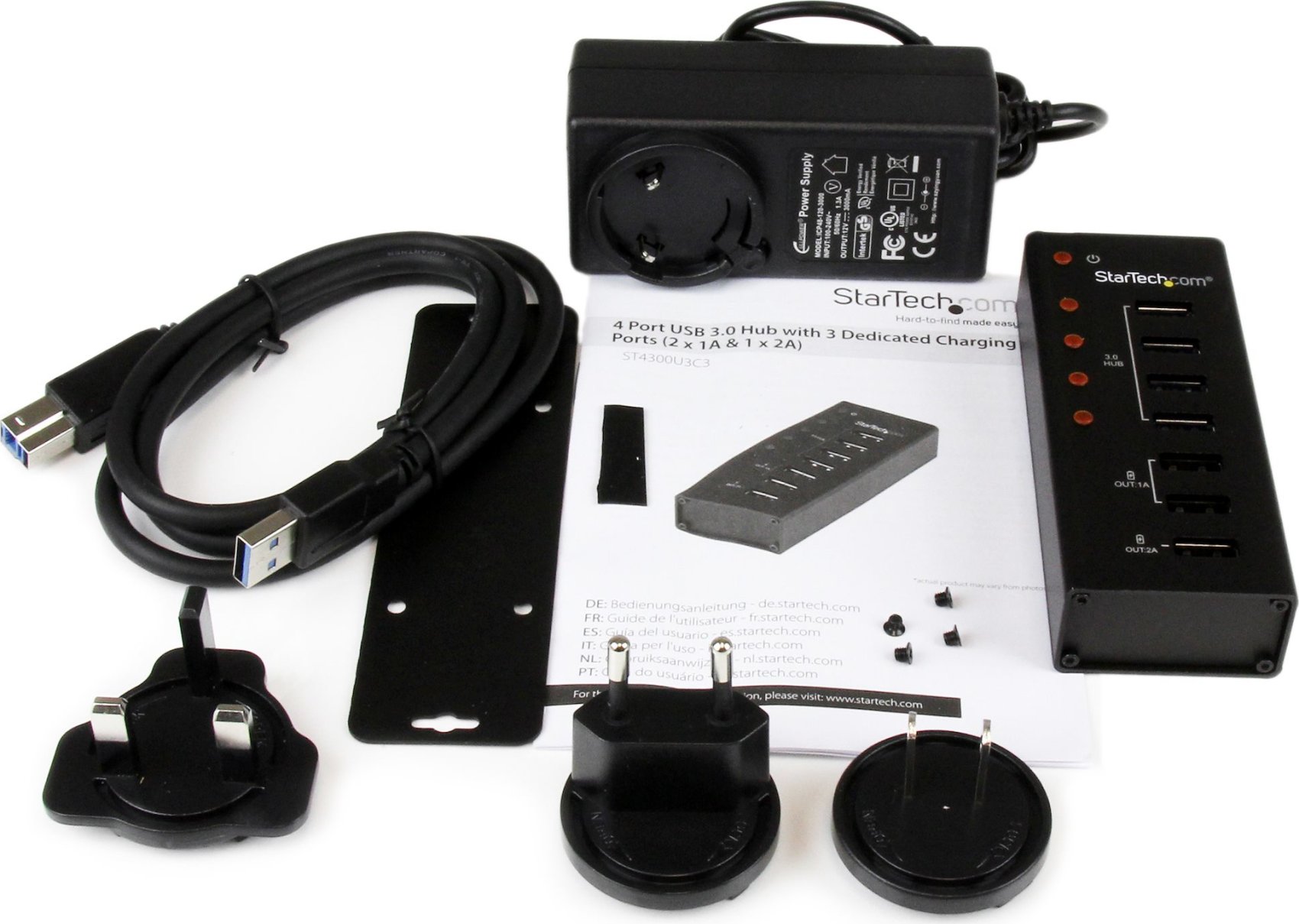 El concentrador USB 3.2 Gen 1, modelo ST4300U3C3, permite la funcionalidad simultánea de concentrador de datos y cargador USB, ya que permite agregar tres puertos USB dedicados, así como cuatro puertos USB de datos, que hacen un total de siete puertos, todos conectados a través de una sola conexión USB 3.2 Gen 1 anfitrión. Los puertos del concentrador USB cumplen con la especificación técnica para SuperSpeed USB 3.2 Gen 1, que permite velocidades de transferencia de datos de hasta 5Gbps, además de retrocompatibilidad con los dispositivos USB 2.0 y 1.x. Este concentrador USB con alimentación externa también integra 3 puertos USB de carga dedicados, 2 x 1A y 1 x 2A, lo cual permite la funcionalidad de concentrador de datos y estación de carga USB. La compatibilidad con la especificación USB para carga de baterías versión 1.2 permite la carga de la mayoría de dispositivos móviles, incluidos iPhone® y iPad® de Apple®, Surface™ de Microsoft®, Samsung Galaxy Tab™ y muchos más. Diseñado para fácil acceso a los puertos cuando se conectan o desconectan dispositivos, el concentrador incluye orientación vertical de los puertos, así como una duradera y compacta caja de metal. Para más flexibilidad, incluye un soporte para instalación en pared.