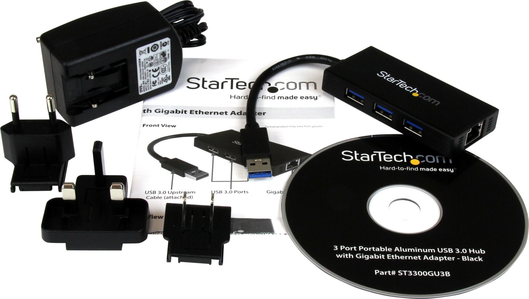 StarTech.com Hub USB 3.0 de Aluminio con Cable - 5Gbps - Concentrador de 3 Puertos USB con Adaptador de Red Ethernet Gigabit. Tecnología de conectividad: Alámbrico, Interfaz de host: USB, Interfaz: Ethernet. Rango máximo de transferencia de datos: 5000 Mbit/s. Color del producto: Negro