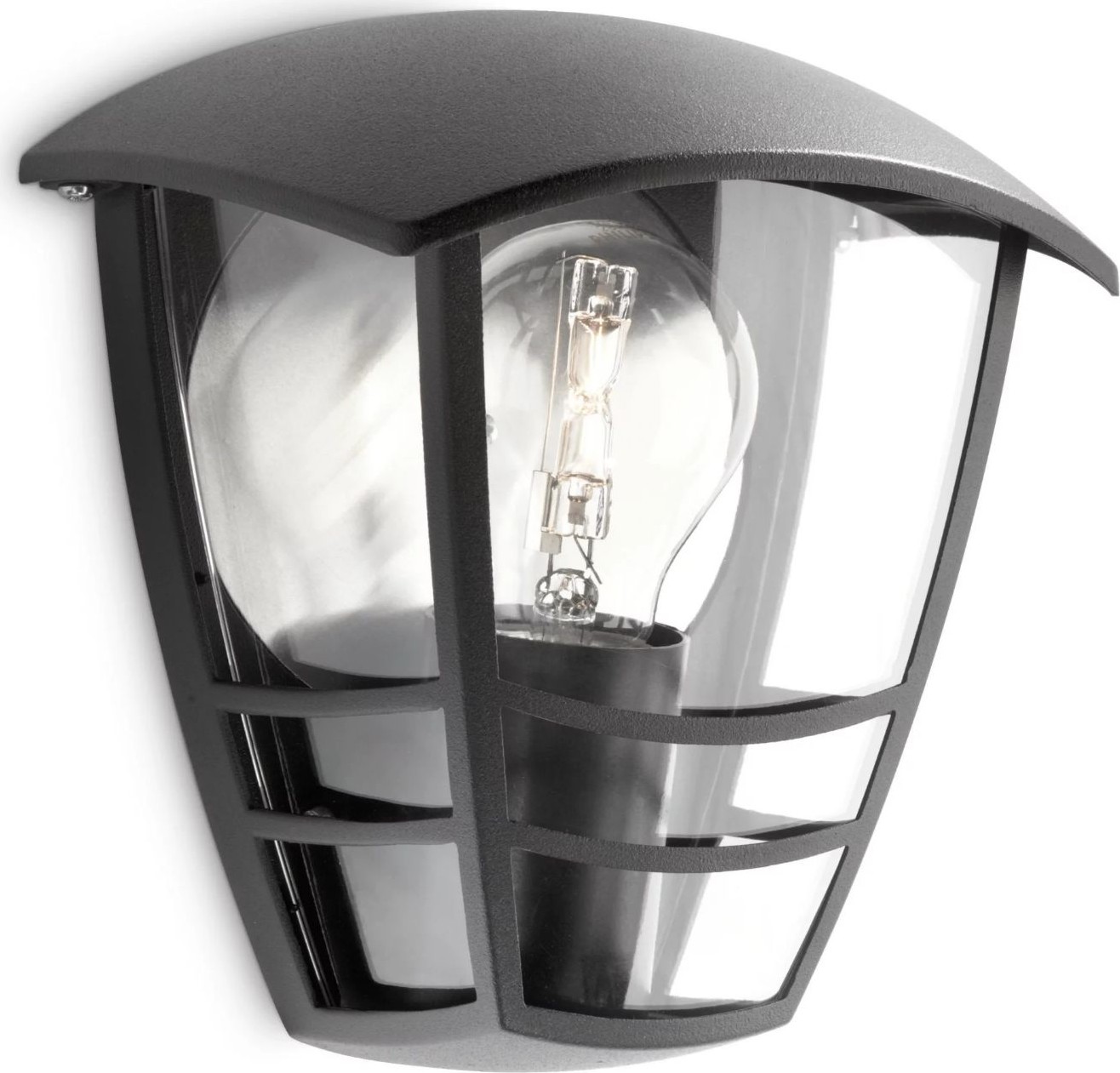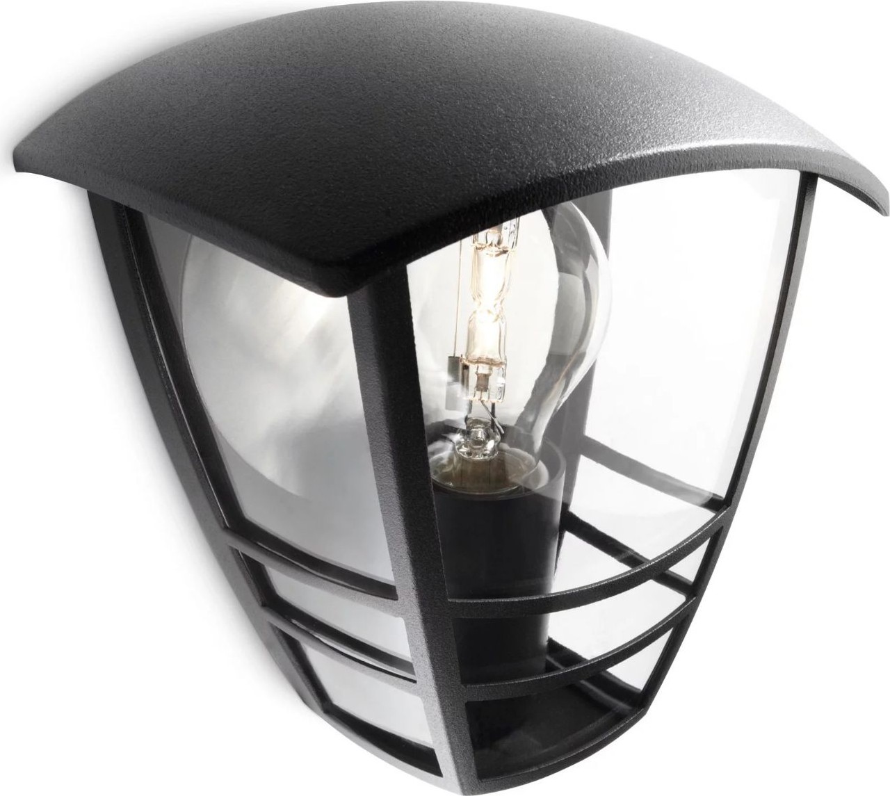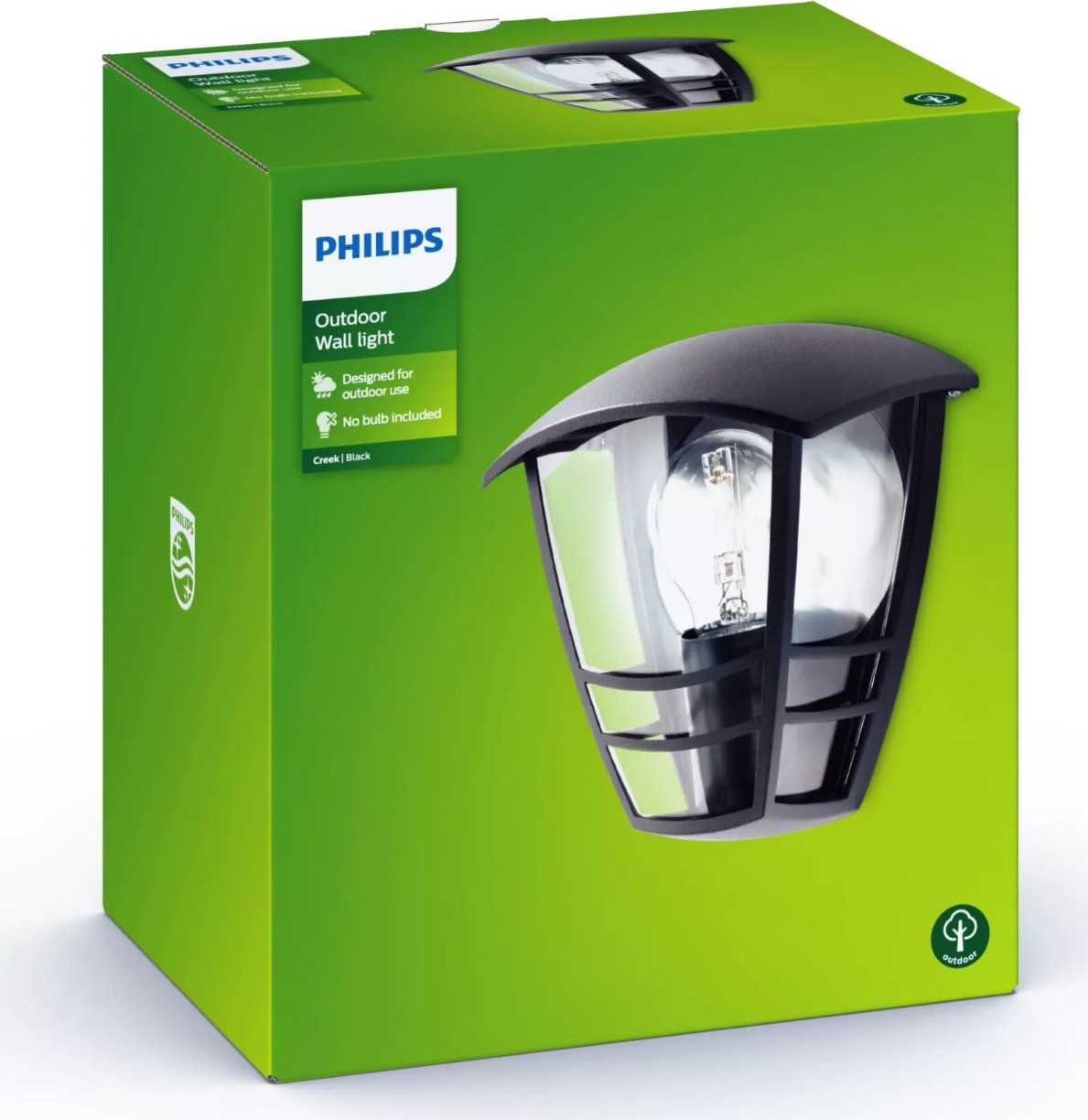 Philips Jardín y exterior Aplique mural Creek 60 W E27 Sin bombilla. Tipo: Aplique de pared para exterior, Color del producto: Negro, Material de la carcasa: Metal. Tipo de tapa de lámpara: E27, Número de bombillas: 1 bombilla(s), Vatios máximos de la bombilla de repuesto: 60 W. Alimentación: Corriente alterna, Voltaje de entrada: 50–60 Гц, Frecuencia de entrada AC: 50-60 Hz. Ancho: 130 mm, Profundidad: 180 mm, Longitud: 180 mm. Cantidad por paquete: 1 pieza(s), Ancho del paquete: 19,3 mm, Profundidad del paquete: 13,8 mm