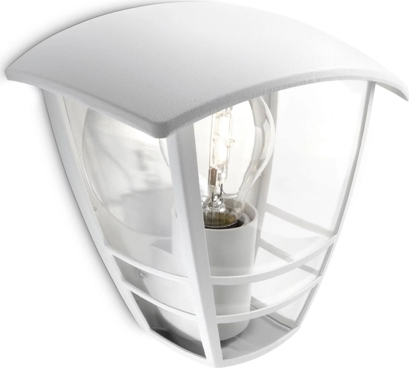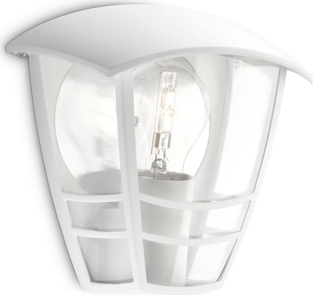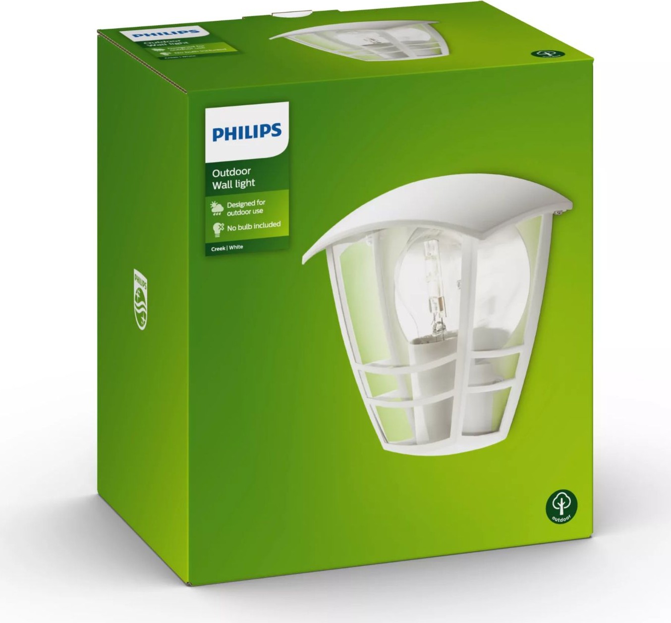 Philips Jardín y exterior Aplique mural Creek 60 W E27 Sin bombilla. Tipo: Aplique de pared para exterior, Color del producto: Blanco, Material de la carcasa: Metal. Tipo de tapa de lámpara: E27, Número de bombillas: 1 bombilla(s), Potencia total: 60 W. Alimentación: Corriente alterna, Voltaje de entrada: 50–60 Hz, Frecuencia de entrada AC: 50-60 Hz. Ancho: 130 mm, Profundidad: 180 mm, Longitud: 180 mm. Cantidad por paquete: 1 pieza(s), Ancho del paquete: 19,3 mm, Profundidad del paquete: 13,8 mm