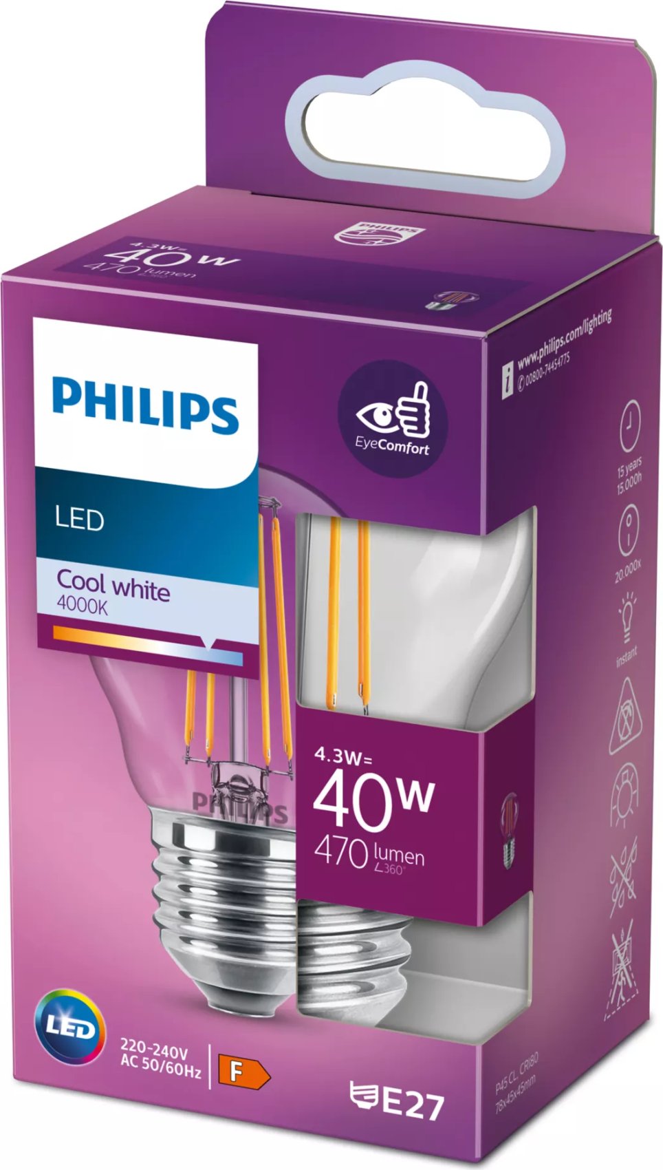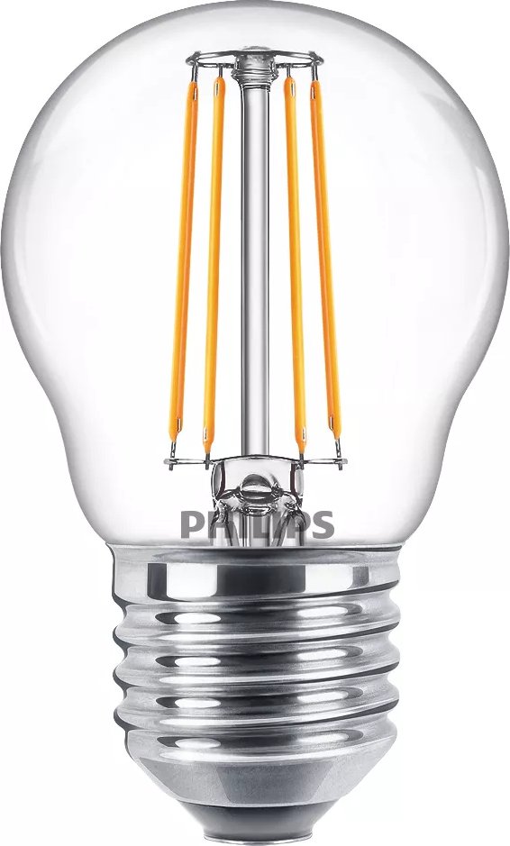 Philips Vela de filamento transparente 40 W P45 E27. Potencia de bombilla: 4,3 W, Potencia de la ampolla equivalente: 40 W, Tipo de tapa de lámpara: E27, Flujo luminoso: 470 lm, Duración de la lámpara: 15000 h, Color de luz: Blanco frío, Temperatura de color: 4000 K, Índice de Entrega de Color (CRI): 80, Factor de poder: 0,41