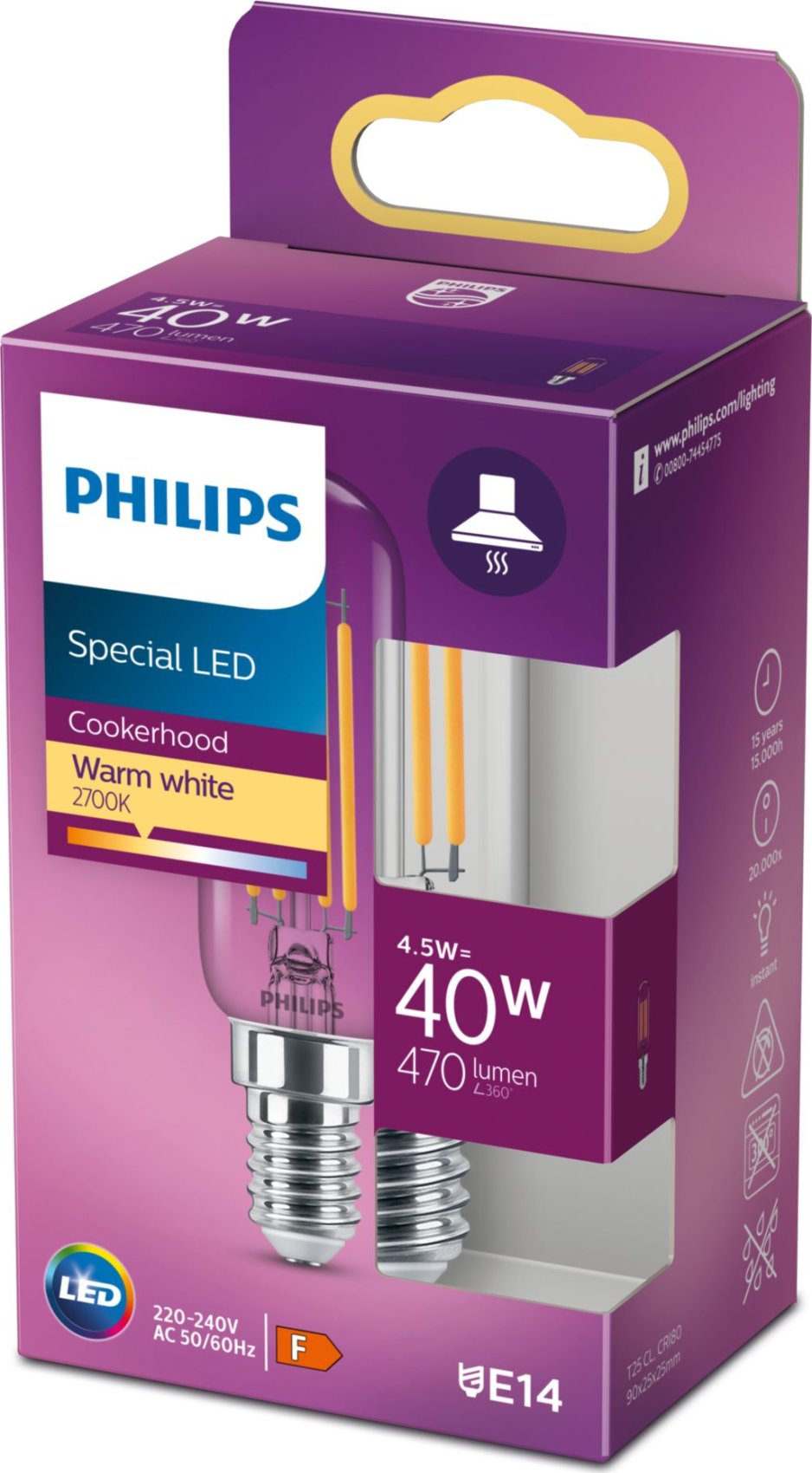 Philips Vela y lustre. Potencia de bombilla: 4,5 W, Potencia de la ampolla equivalente: 40 W, Tipo de tapa de lámpara: E14, Flujo luminoso: 470 lm, Duración de la lámpara: 15000 h, Color de luz: Blanco cálido, Temperatura de color: 2700 K, Índice de Entrega de Color (CRI): 80, Factor de poder: 0,51