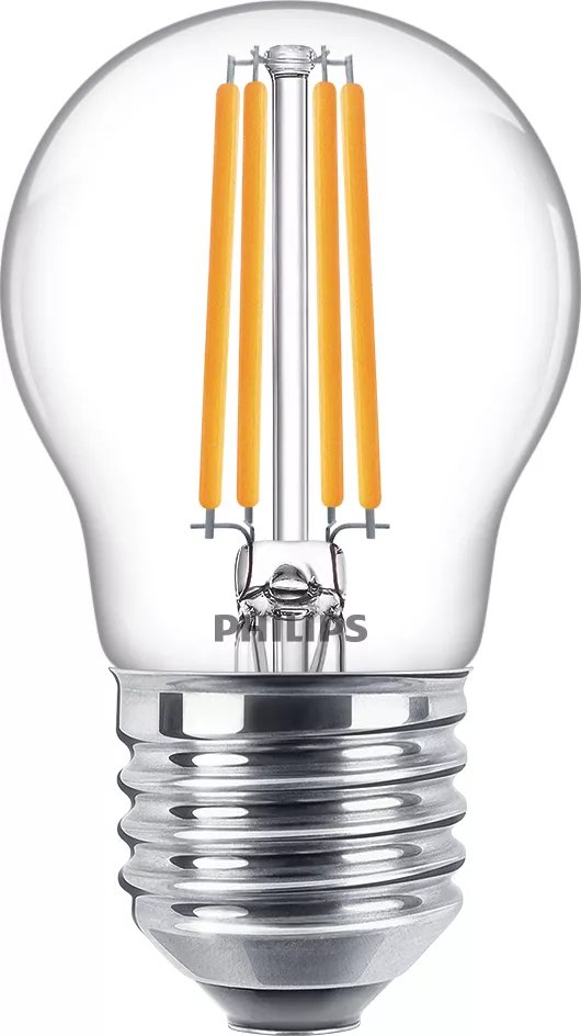 Philips Vela de filamento transparente 60 W P45 E27. Potencia de bombilla: 6,5 W, Potencia de la ampolla equivalente: 60 W, Tipo de tapa de lámpara: E27, Flujo luminoso: 806 lm, Duración de la lámpara: 15000 h, Color de luz: Blanco cálido, Temperatura de color: 2700 K, Índice de Entrega de Color (CRI): 80, Factor de poder: 0,55