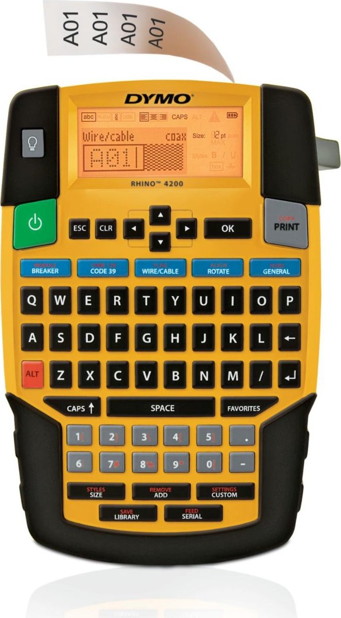 La DYMO Rhino™ 4200 convierte el etiquetado en una operación rápida y sencilla. Navegue con facilidad con su familiar teclado QWERTY. Use las “teclas de acceso directo” con una sola pulsación para crear rápidamente y dar formato a etiquetas de cable/hilo, códigos de barras Code 39 y Code 128, etiquetas de longitud fija, etiquetas de módulos, etc. Imprima etiquetas de 19 mm de ancho en nailon flexible, poliéster permanente y materiales duraderos de vinilo, y ADEMÁS imprima directamente en tubos termorretráctiles. Ahorre incluso más tiempo con sus increíbles funciones: como la tecla “Favoritos”, que proporciona acceso con una sola tecla a las etiquetas, símbolos y términos de uso más frecuente; y la tecla “Personalizado” que elimina la repetición de pasos innecesarios al guardar la configuración personalizada.
