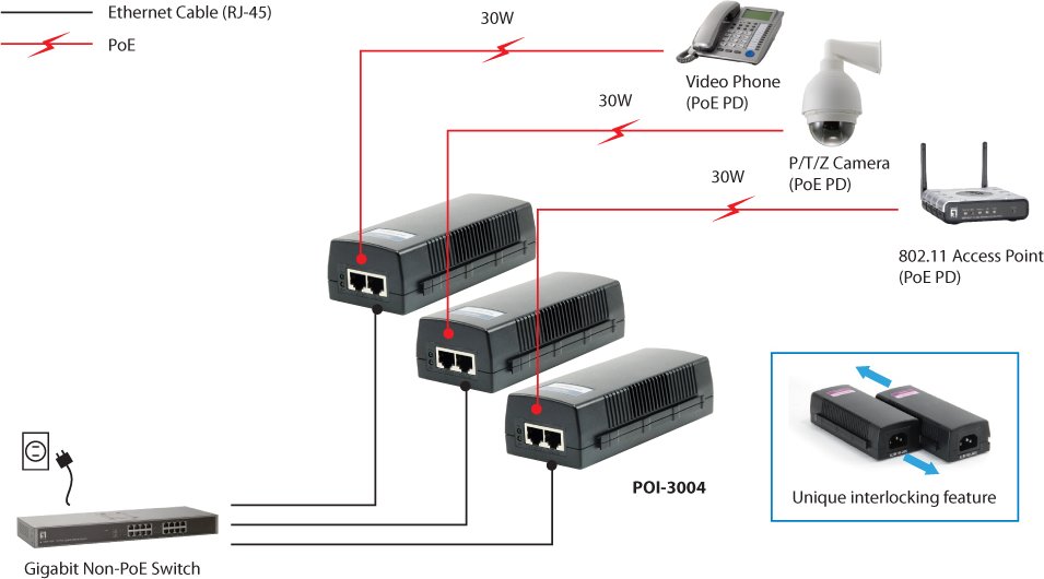 Poe Injector Adapter Gigabit Level One Pasa Datos Y Alimentacion Por El Mismo Cable 30w Negro Poi-3004