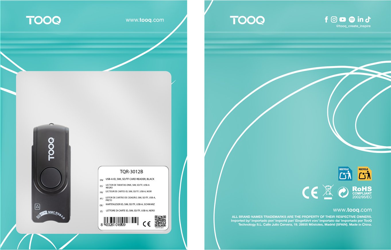 TooQ Lector Tarjetas Inteligentes, DNI Electrónico, SIM, SD, SF, USB-A, Negro. Interfaz: USB 2.0. Métodos de pago admitidos: EMV (Chip & PIN). Color del producto: Negro. Peso: 22 g