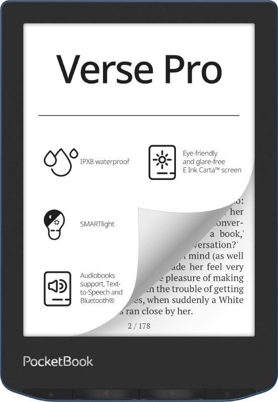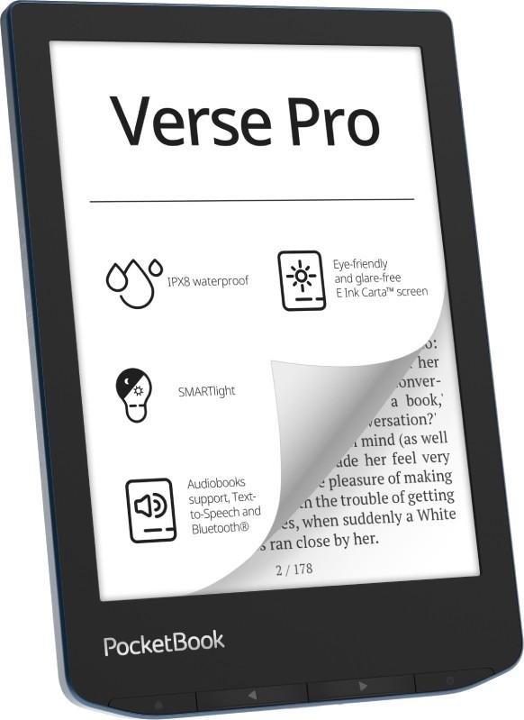 PocketBook Verse Pro. Diagonal de la pantalla: 15,2 cm (6"), Tecnología: E Ink Carta, Resolución de la pantalla: 1072 x 1448 Pixeles. Formatos de texto soportados: ACSM, AZW, AZW3, CBR, CBZ, CHM, DOC, DOCX, DjVu, EPUB, EPUB DRM, FB2, FB2.ZIP, HTM, HTML, MOBI,..., Formatos de audio soportados: M4A, M4B, MP3, OGG, Formatos de imagen soportados: BMP, JPEG, PNG, TIFF. Capacidad de almacenamiento interno: 16 GB, Capacidad de RAM: 512 MB. Frecuencia del procesador: 1000 MHz. Conector USB: USB Tipo C, Auriculares: 3,5 mmMarca: