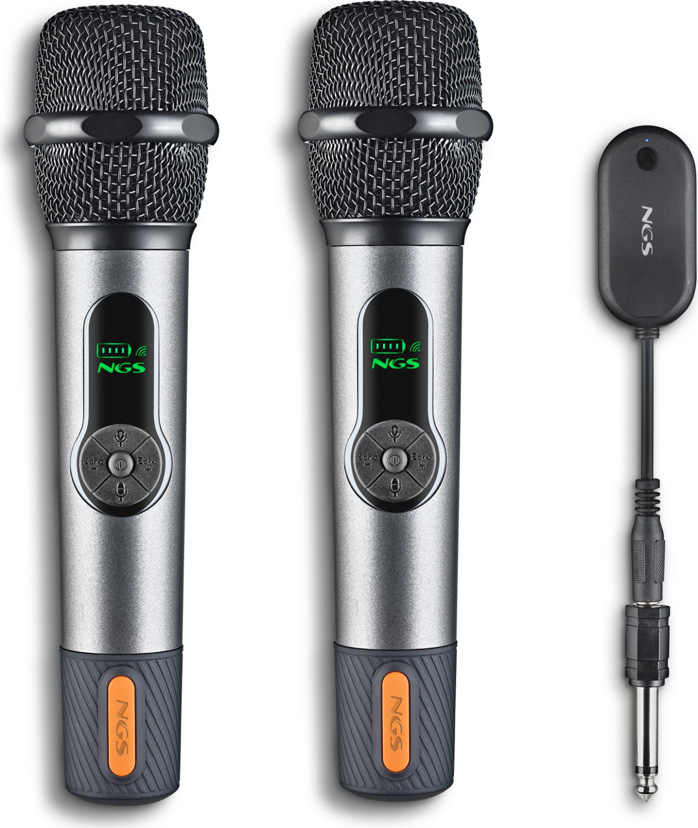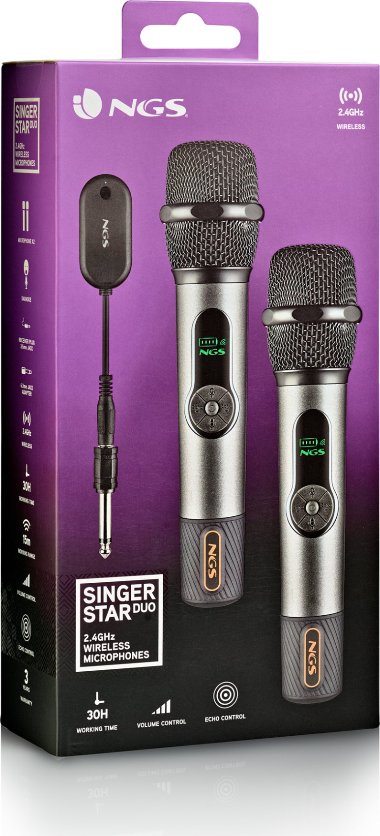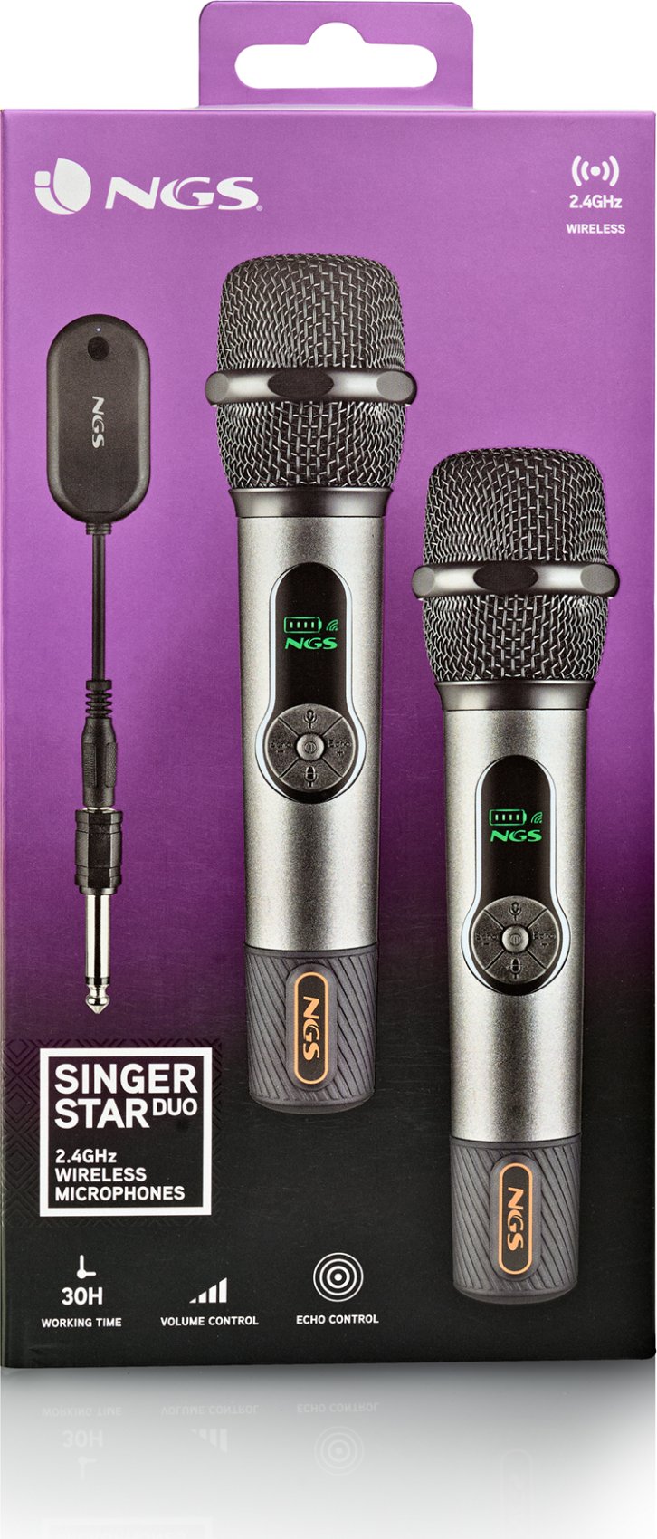 NGS SINGER STAR DUO. Tipo: Micrófono vocal, Frecuencia de micrófono: 15 - 12000 Hz, Micrófono, relación señal/ruido: 86 dB. Tecnología de conectividad: Inalámbrico, Interfaz del dispositivo: RF, Distancia de funcionamiento máximo: 15 m. Color del producto: Negro. Fuente de energía: Batería, Tecnología de batería: Ión de litio, Capacidad de batería: 1500 mAh. Altura: 210 mm, Diámetro: 4,8 cm, Peso del micrófono: 210 g
