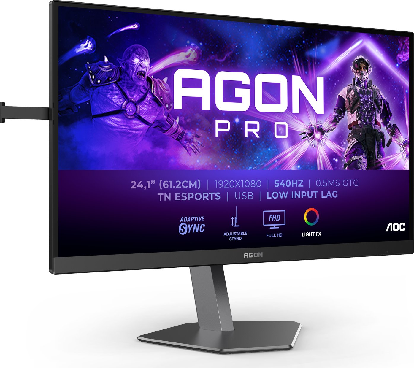 AOC AGON PRO AG246FK. Diagonal de la pantalla: 61,2 cm (24.1"), Resolución de la pantalla: 1920 x 1080 Pixeles, Tipo HD: Full HD, Tecnología de visualización: LCD, Tiempo de respuesta: 0,3 ms, Relación de aspecto nativa: 16:9. Conector USB incorporado, Versión de conector USB: 3.2 Gen 1 (3.1 Gen 1). montaje VESA, Ajustes de altura. Color del producto: Negro