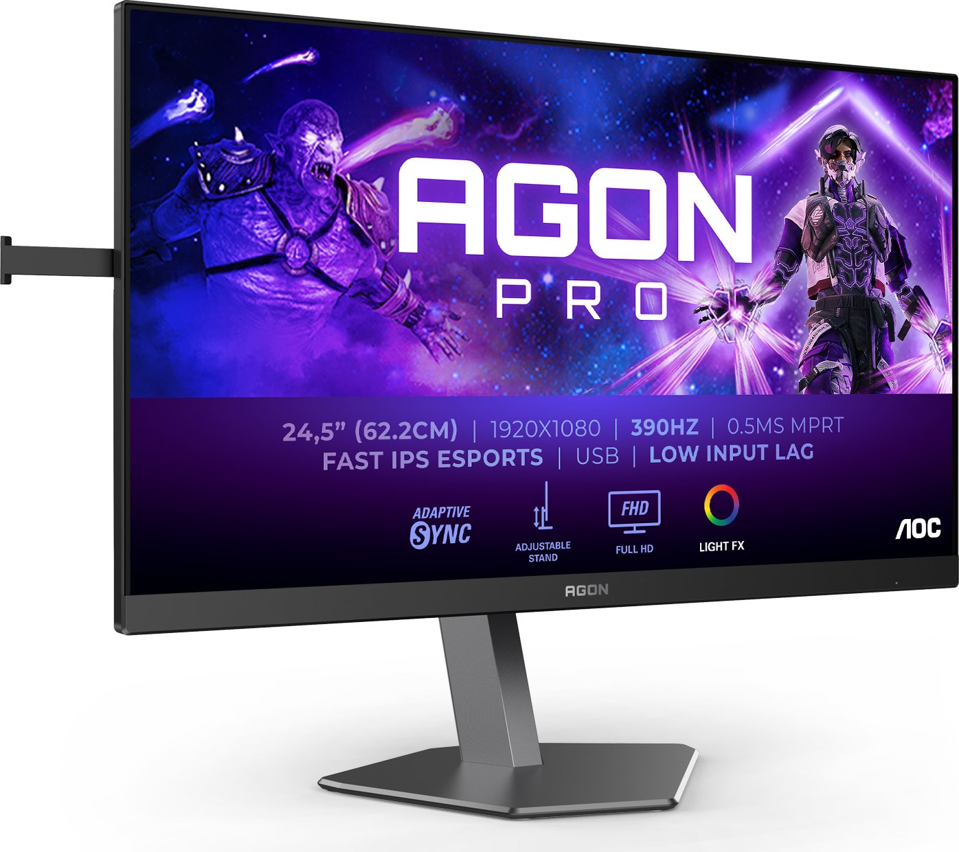 AOC AGON PRO AG256FS. Diagonal de la pantalla: 62,2 cm (24.5"), Resolución de la pantalla: 1920 x 1080 Pixeles, Tipo HD: Full HD, Tecnología de visualización: LCD, Tiempo de respuesta: 0,3 ms, Relación de aspecto nativa: 16:9. Conector USB incorporado, Versión de conector USB: 3.2 Gen 1 (3.1 Gen 1). montaje VESA, Ajustes de altura. Color del producto: Negro