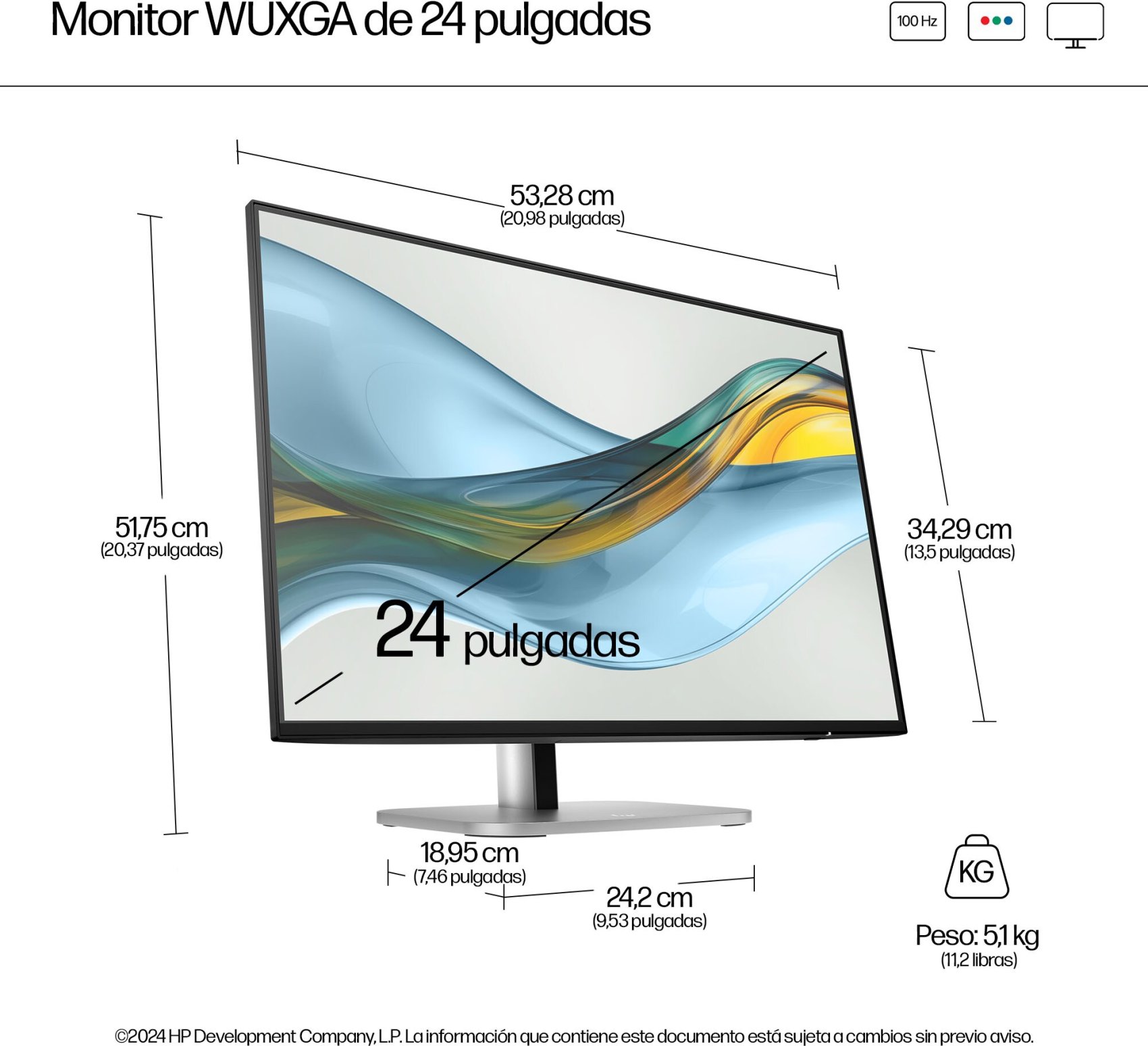 HP Series 5 Monitor Pro de la serie 5 con resolución WUXGA de 24 pulgadas: 524 pn. Diagonal de la pantalla: 61 cm (24"), Resolución de la pantalla: 1920 x 1200 Pixeles, Tipo HD: WUXGA, Tecnología de visualización: LCD, Superficie de la pantalla: Mate, Tiempo de respuesta: 5 ms, Relación de aspecto nativa: 16:10, Ángulo de visión, horizontal: 178°, Ángulo de visión, vertical: 178°. Conector USB incorporado, Versión de conector USB: 3.2 Gen 1 (3.1 Gen 1). montaje VESA, Ajustes de altura. Color del producto: Negro