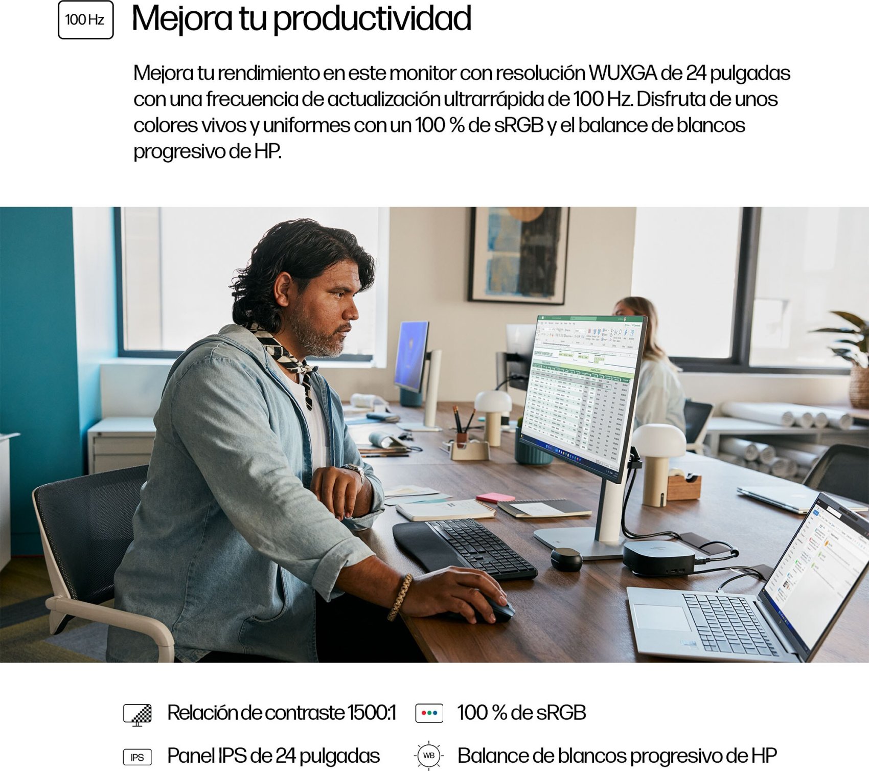 Consigue ampliar la visión y mejora tu rendimiento con este monitor con resolución WUXGA de 24 pulgadas. La rapidísima frecuencia de actualización de 100 Hz[1] realza todos los detalles. Amplía aún más tu visión con unos colores vivos, brillantes y uniformes, un 100 % de sRGB[1] y el balance de blancos progresivo de HP.[2]