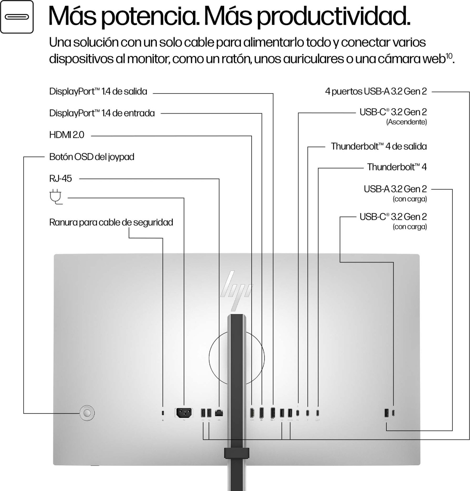 Un mayor número de puertos equivale a un mayor número de capacidades. Gracias a los puertos Thunderbolt™ 4, USB-C® (ascendente), HDMI 2.0, entrada y salida DisplayPort™ 1.4, RJ-45, 1 USB-C® 3.2 Gen 2 y 5 USB-A 3.2 Gen 2, puedes conectar varios monitores, así como un ratón y teclado, entre otras muchas opciones. [10]