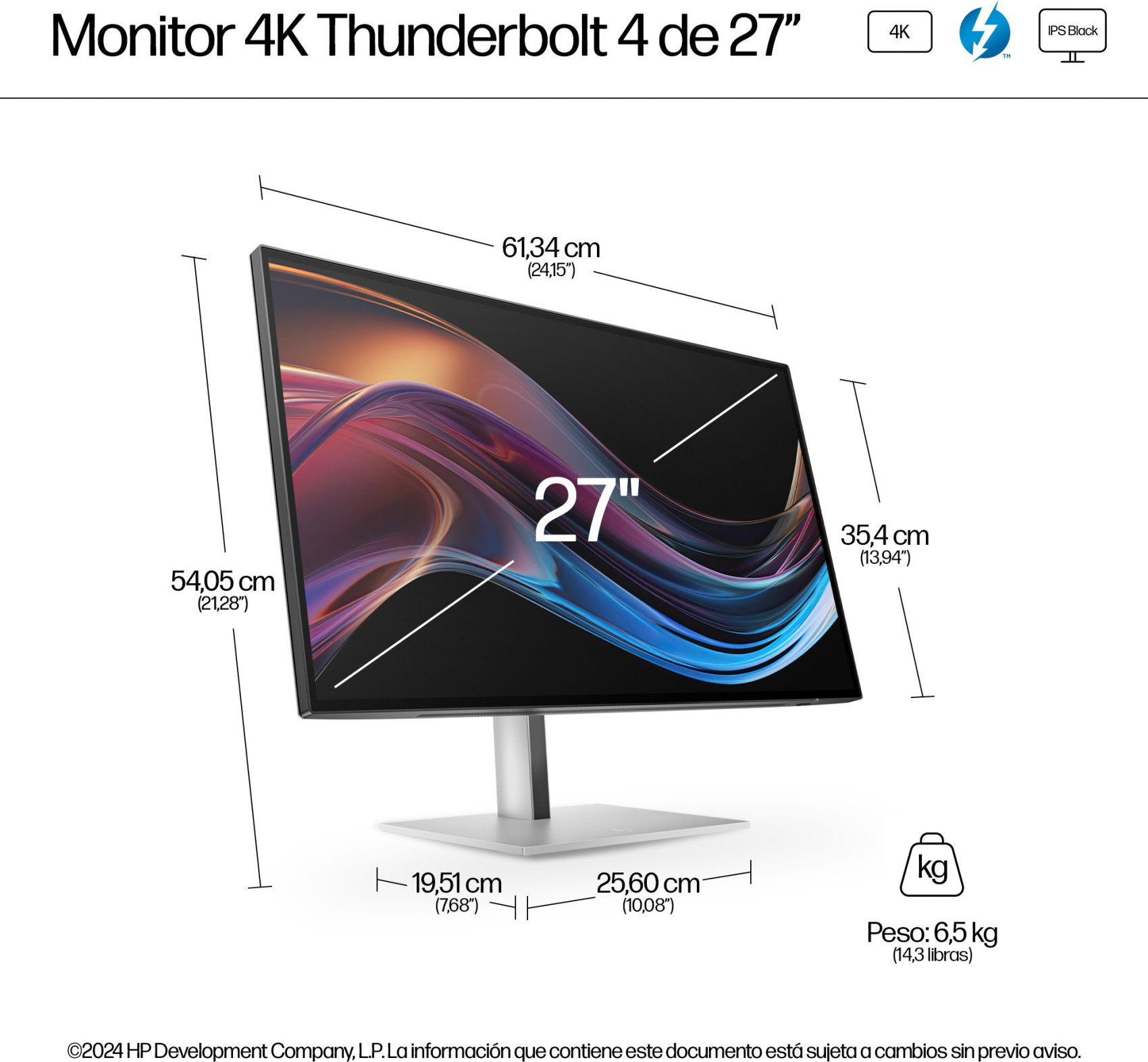 HP Monitor 4K Thunderbolt 4 Pro de la serie 7 de 27 pulgadas: 727pk. Diagonal de la pantalla: 68,6 cm (27"), Resolución de la pantalla: 3840 x 2160 Pixeles, Tipo HD: 4K Ultra HD, Tecnología de visualización: LCD, Superficie de la pantalla: Mate, Tiempo de respuesta: 5 ms, Relación de aspecto nativa: 16:9, Ángulo de visión, horizontal: 178°, Ángulo de visión, vertical: 178°. Conector USB incorporado, Versión de conector USB: 3.2 Gen 2 (3.1 Gen 2). montaje VESA, Ajustes de altura. Color del producto: Negro