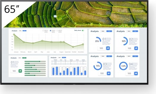 Sony FW-65BZ30L. Diseño de producto: Pantalla plana para señalización digital. Diagonal de la pantalla: 165,1 cm (65"), Tecnología de visualización: LCD, Resolución de la pantalla: 3840 x 2160 Pixeles, Brillo de pantalla: 440 cd / m², Tipo HD: 4K Ultra HD. Wifi. Horas de funcionamiento (horas/días): 24/7. Sistema operativo instalado: Android. Color del producto: Negro