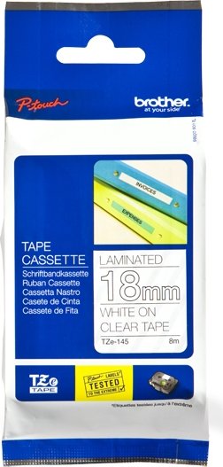 Brother TZE-145. Color de etiqueta: Blanco sobre transparencia, Tipo de cinta: TZe, Color del producto: Gris. Ancho de cinta: 1,8 cm, Longitud de cinta: 8 m, Ancho: 23 mm. Tamaño de cinta: 1,8 cm