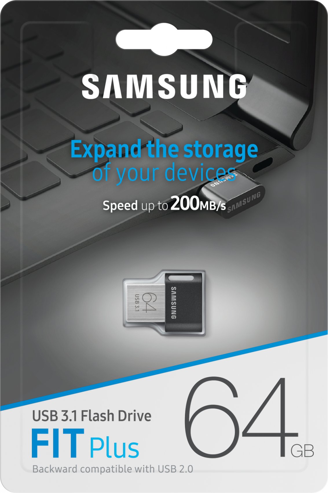 Samsung MUF-64AB. Capacidad: 64 GB, Interfaz del dispositivo: USB tipo A, Versión USB: 3.2 Gen 1 (3.1 Gen 1), Velocidad de lectura: 300 MB/s, Velocidad de escritura: 30 MB/s. Factor de forma: Sin tapa. Protección mediante contraseña. Peso: 3,1 g. Color del producto: Gris, Plata