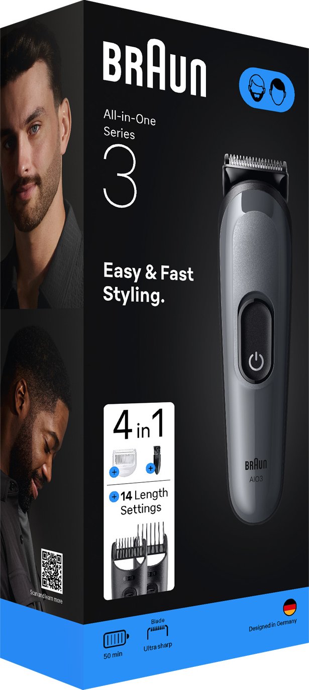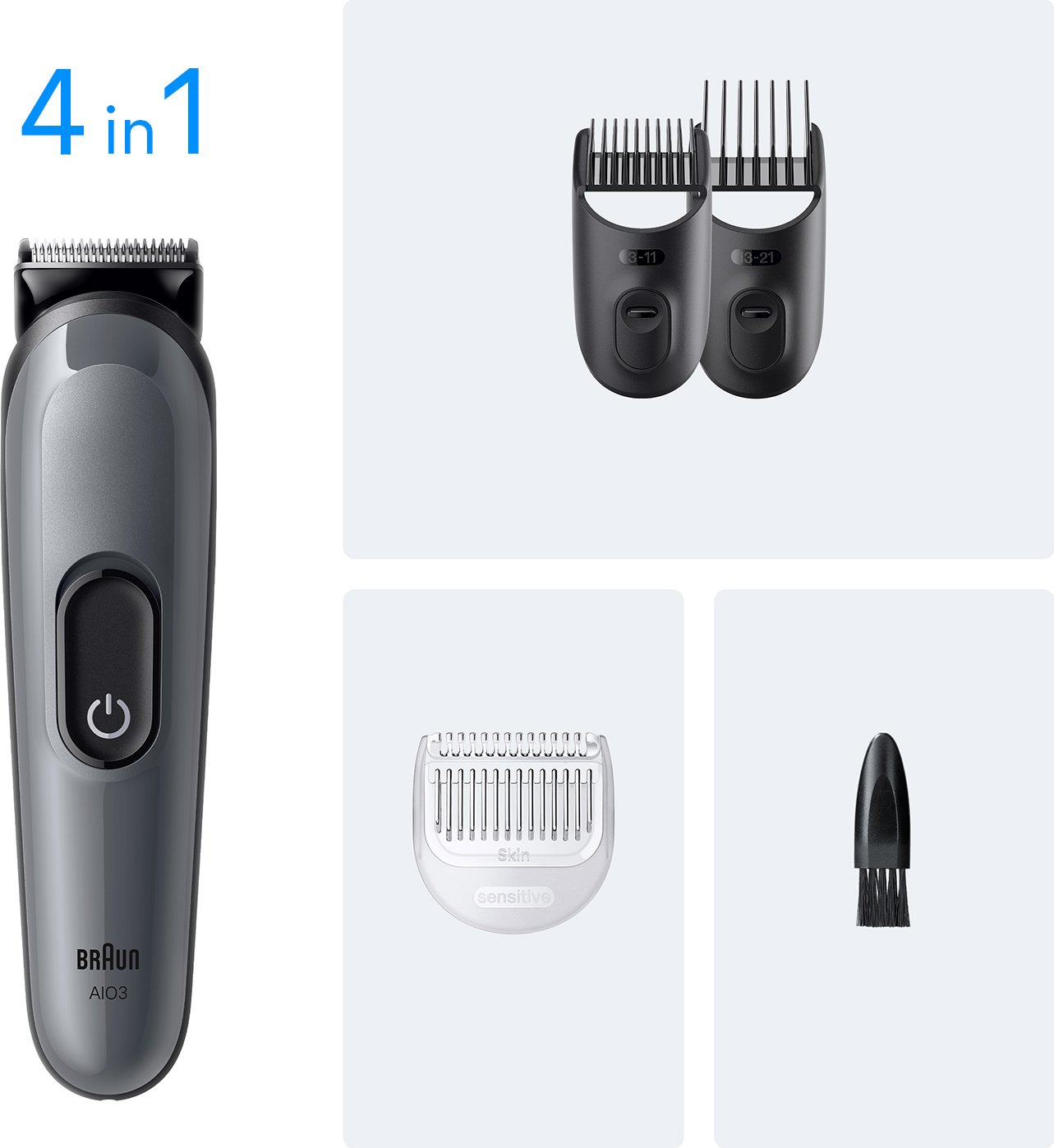 Braun AIO3500. Color del producto: Negro, Gris, Longitud mínima del cabello: 0,5 mm, Longitud máxima del cabello: 2,1 cm. Fuente de energía: Batería, Tiempo de funcionamiento: 50 min, Tipo de batería: Batería integrada. Ancho: 42 mm, Profundidad: 41 mm, Altura: 165 mm. Tipo de embalaje: BoxMarca: