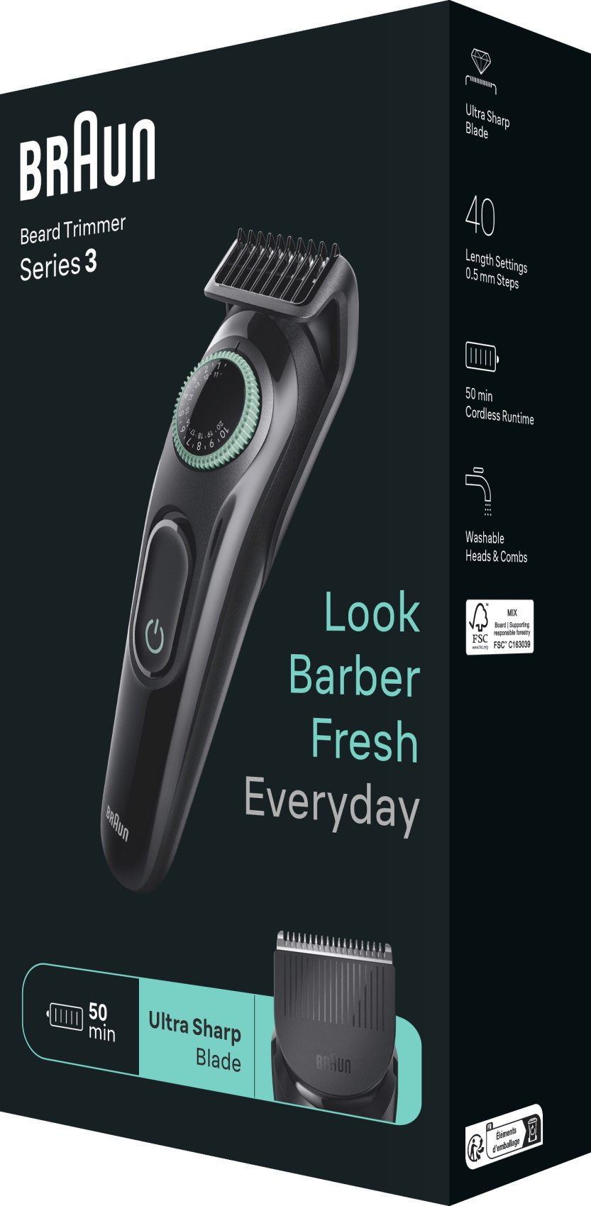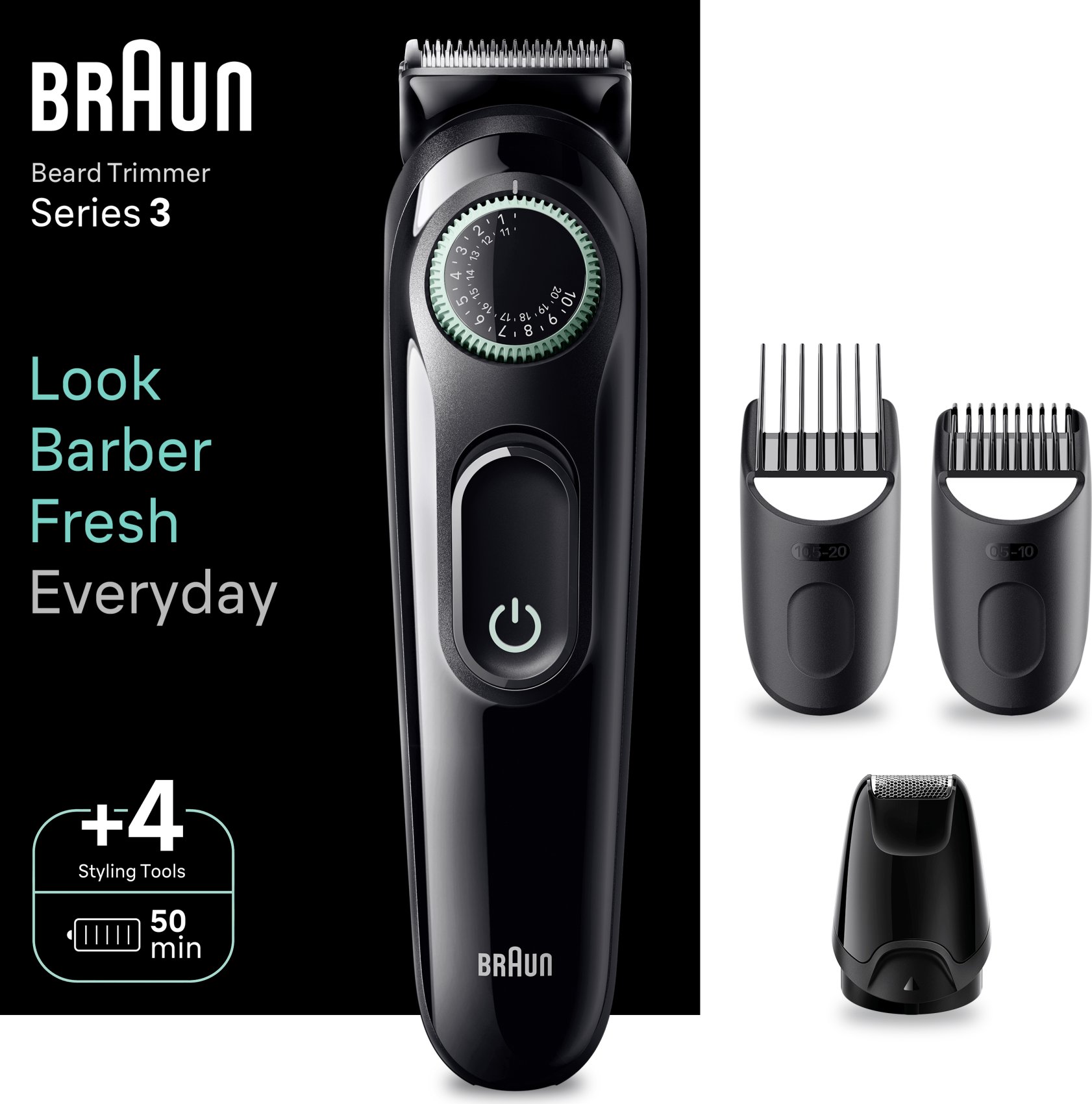 Braun BeardTrimmer 3 BT3421. Longitud mínima del cabello: 0,5 mm, Longitud máxima del cabello: 2 cm, Cortapelos para barba: 0,5 mm. Color del producto: Negro. Fuente de energía: Batería, Tiempo de funcionamiento: 50 min, Tipo de batería: Batería integrada