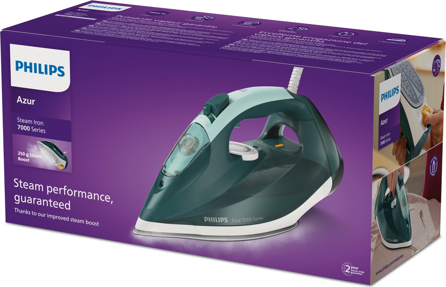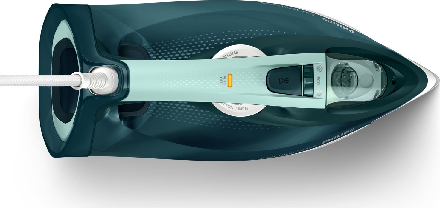 Philips 7000 series DST7031/70 Plancha de vapor HV en verde ópalo/menta. Tipo: Plancha a vapor, Material de la suela/recubrimiento: Suela SteamGlide Plus, Longitud del cable: 2 m. Potencia de la plancha: 2800 W, Voltaje de entrada AC: 220 - 240 V, Frecuencia de entrada AC: 50 - 60 Hz