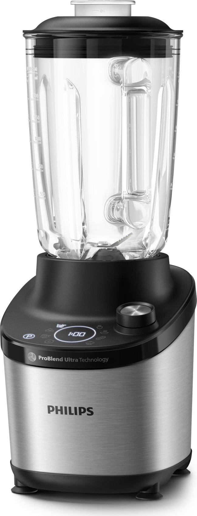 Philips 7000 series HR3760/00 Batidora de alta velocidad. Tipo: Batidora de vaso, Longitud del cable: 1 m, Tecnologías específicas: ProBlend Ultra. Velocidad de rotación (máx.): 22000 RPM, Tipo de control: Giratorio, Capacidad de jarra: 2 L. Material del vaso: Vidrio, Material de la carcasa: Metal, Material de la cuchilla: Acero inoxidable. Potencia: 1500 W, Fuente de energía: Corriente alterna, Voltaje de entrada AC: 230 V. Ancho: 167 mm, Profundidad: 216 mm, Altura: 442 mm