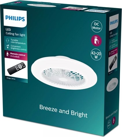 Philips Plafón con ventilador Amigo 42+20 W. Color del producto: Blanco, Material de la carcasa: Plástico, Código IP (International Protection): IP20. Voltaje de entrada AC: AC 220-24, Frecuencia de entrada AC: AC 220-240, Voltaje de entrada: AC 220-240. Ancho: 485 mm, Profundidad: 485 mm, Longitud: 485 mm. Ancho del paquete: 51 mm, Profundidad del paquete: 15,5 mm, Altura del paquete: 51,5 mm. Estilo de iluminación: ContemporáneoMarca: